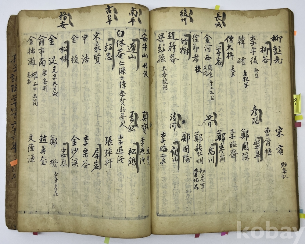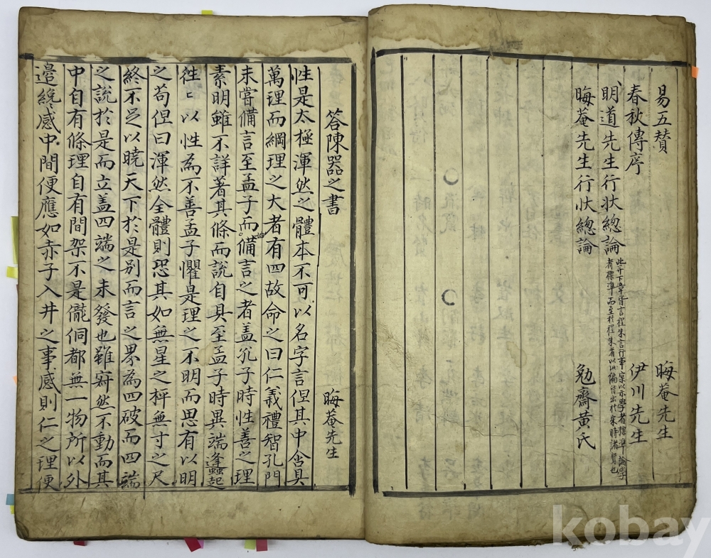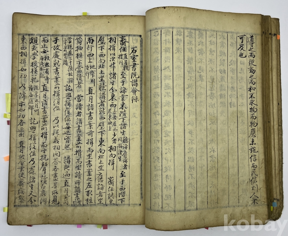 설 명 | ‘아송(雅誦)’, ‘어제조문(御製條問)’과 내지에 ‘기묘제현전(己卯諸賢傳)’, ‘해동원사록(海東院祠錄)’이 보이는 필사본이다. ‘아송’의 목록을 보면 정조의 ‘어제아송’이 아니라 회암선생, 이천선생, 구봉제씨, 남헌선생 등이 저술한 ‘태극도설, 성선설, 숙흥야매장, 심잠, 동명(東銘), 서명(西銘), 대학혹문수장설’ 등의 다수 글을 수록했다. 이어 조선후기 정조 연간에 경서에 관한 왕의 설문을 비롯한 여러 해설들을 수록하여 간행한 어제조문(御製條問)이 이어진다. 내지에는 조선후기 문신 김육이 기묘사화와 관련된 내용들을 수록한 정치서인 ‘기묘제현전(己卯諸賢傳)’의 신익성 서문과 그 관련 인물리스트를 적은 몇 페이지에서 시작하다가 중간 부분에서 조선 중기 학자인 모계 변시준의 문집에 포함된 인물 및 서원 관련 자료로, 당시 명신들의 기록인 해동명신록 등과 함께 정리된 문헌인 해동원사록(海東院祠錄)이 끝까지 필사되었다. 물품번호 71번 | |||||