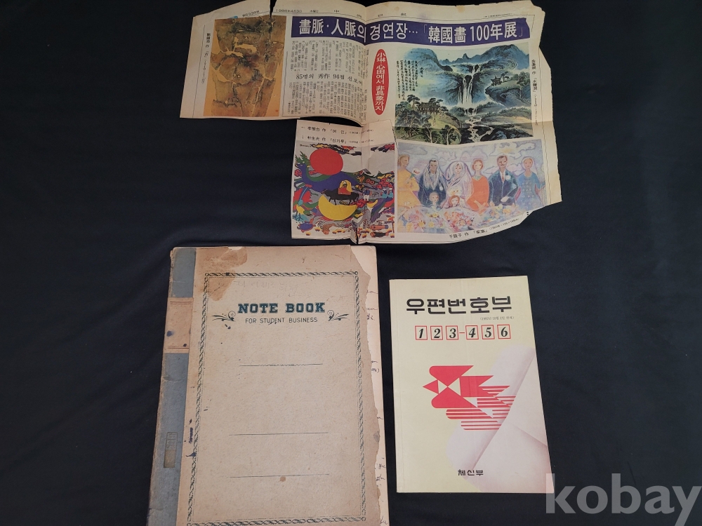 빈티지 세월 감이 느껴지는 1992년 우편 번호부와 무언가 필기가 되어있는 옛날 노트, 신문 스크랩 등 잡화 3종 일괄입니다.