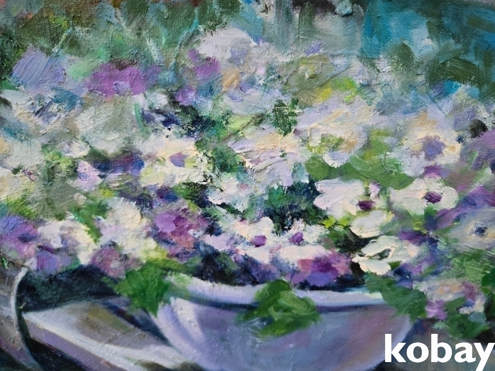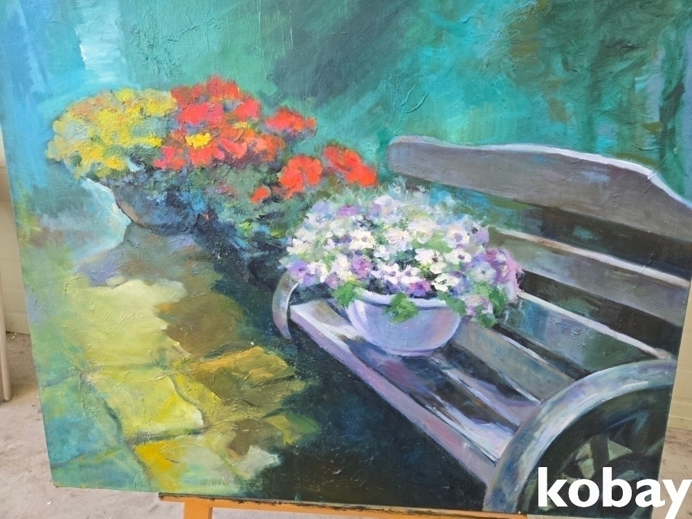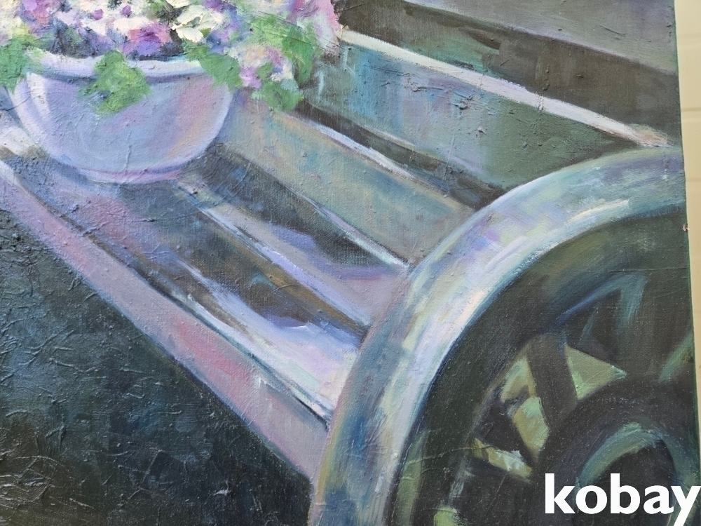 벤취위에 화분을 표현한 유화 그림 입니다.