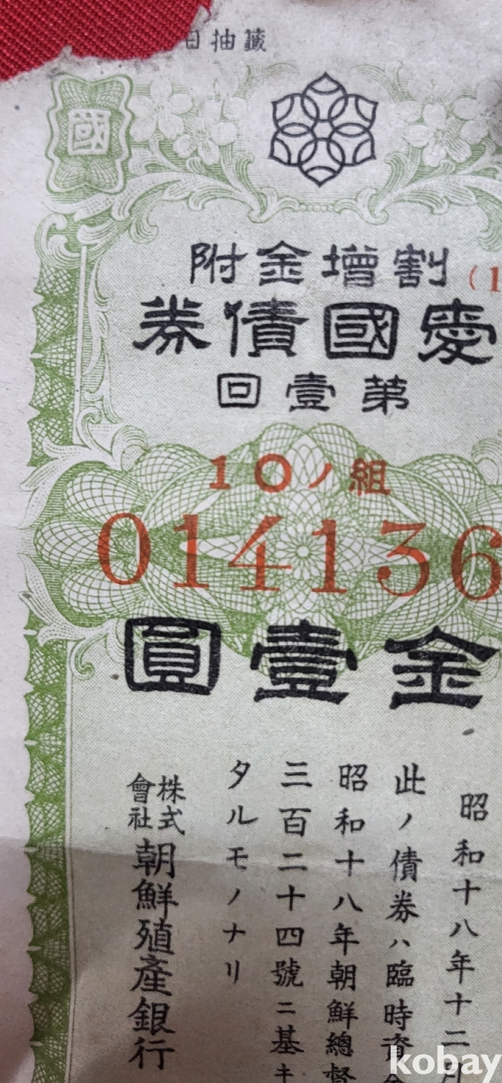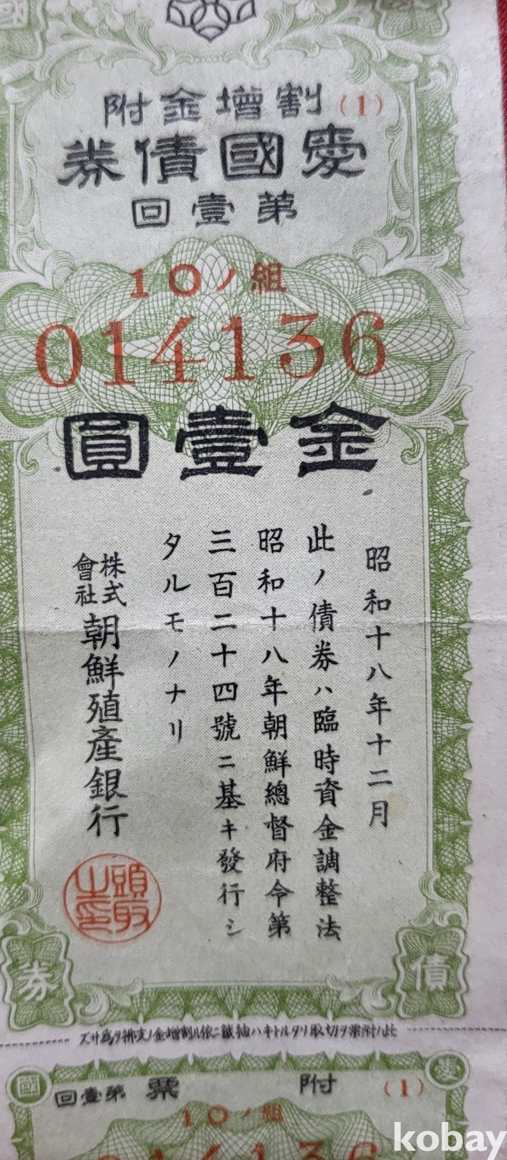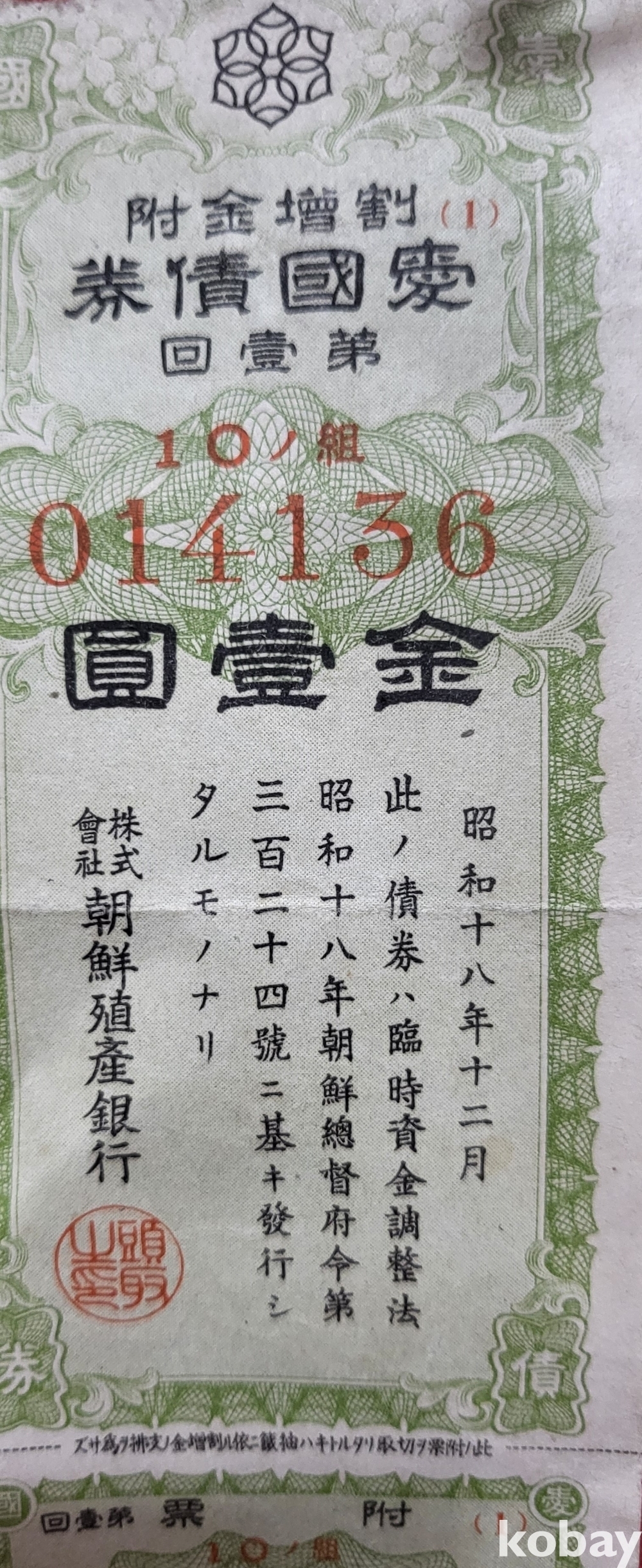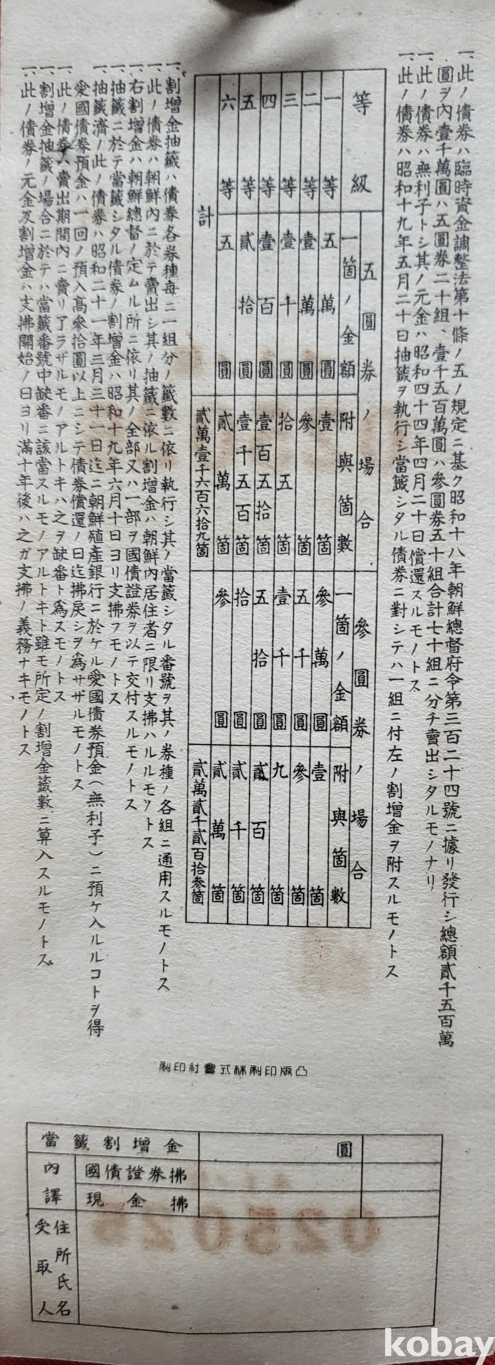 주식회사 조선 직산은행 소하19년(1943년) 발행된 할증금부(割增金附)입니다,