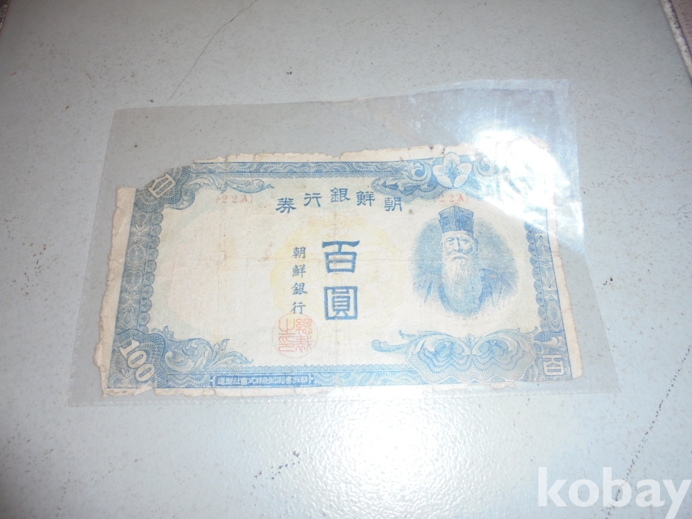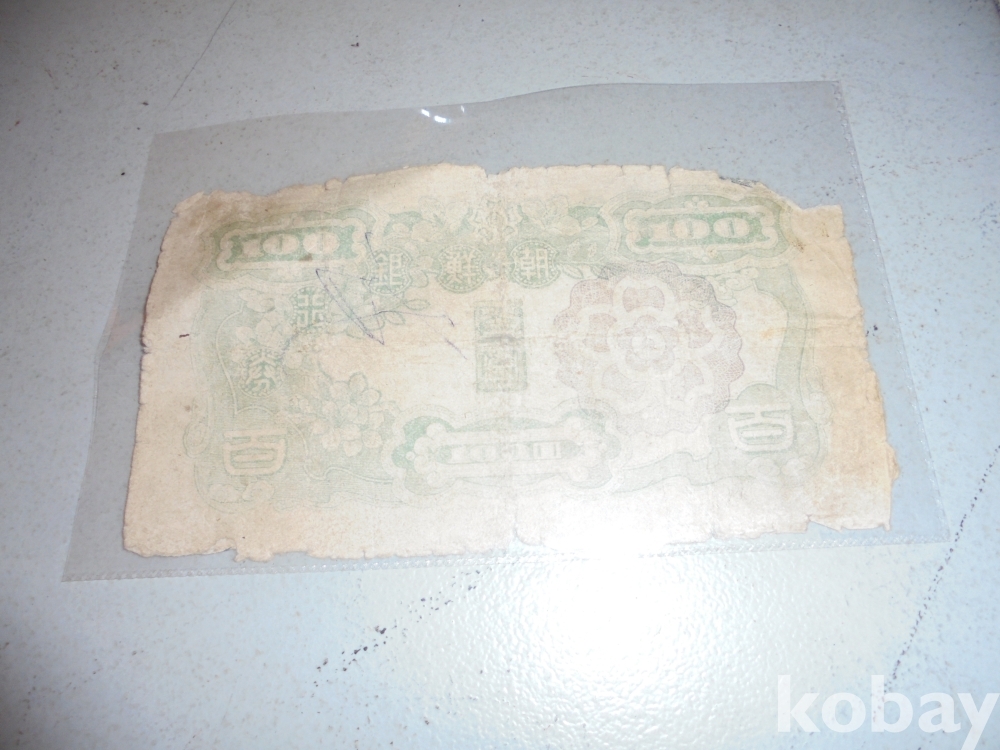 왜정시대말기 조선일본 합동으로 현대와 같은 지폐로 조선은행권 백원 짜리지폐로 오래되여 귀가혜어진 백원지폐