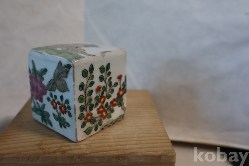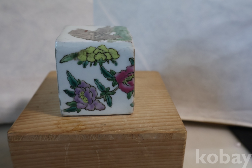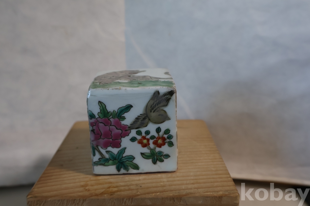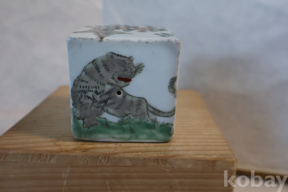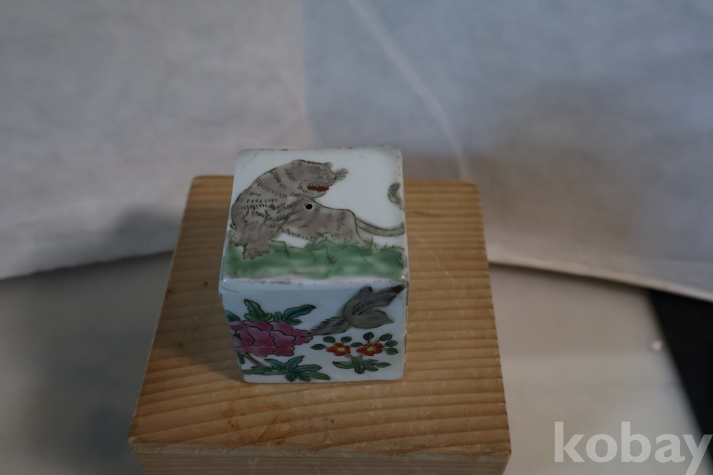 묵직한 도자기 도장 임니다 위에는 호랑이 그림이 보이고 사면으로 화조도를 가진 귀한 도장 임니다 중국 도장 임니다 대청건륭?이 보이는 오래전 고미술 임니다 유일무이한 명품