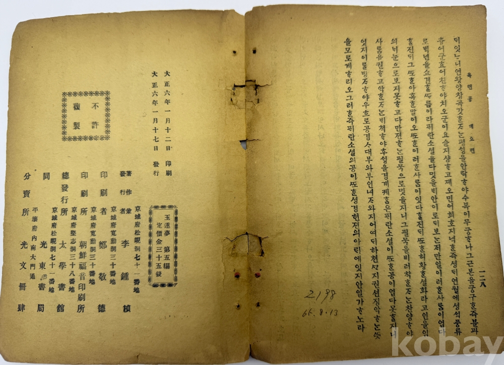 물 품 명 | <좋-았書! 2탄> [21] 1917년 경성 태학서관, 광동서국 발행 [옥련몽(옥루몽, 玉蓮夢)] 제5편 1책 | |||||