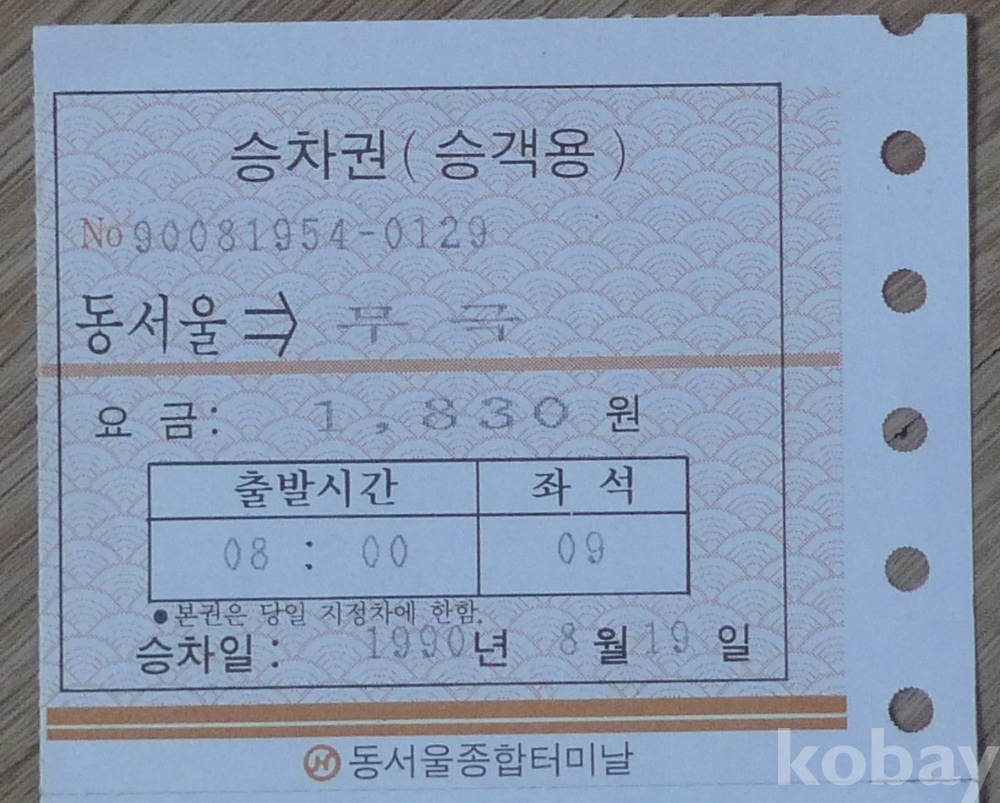 1990년 서울 - 무극 시외 버스 승차권