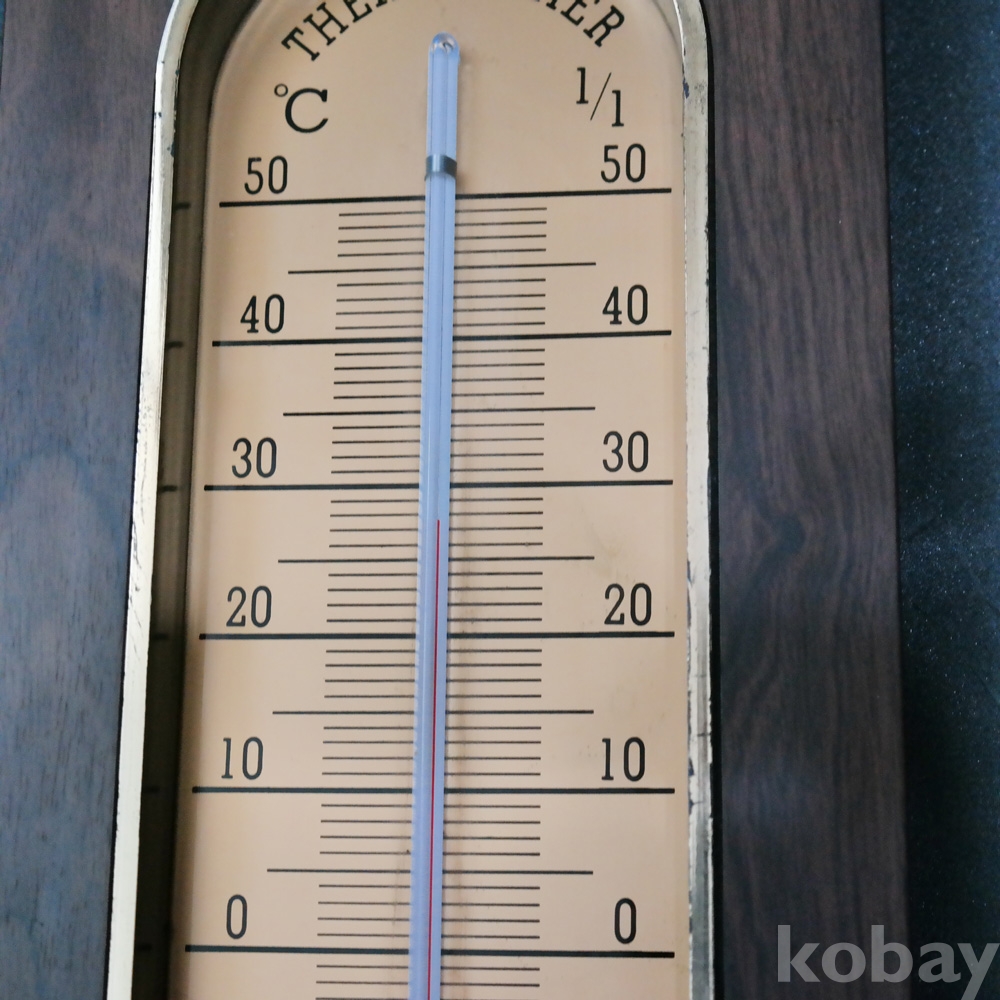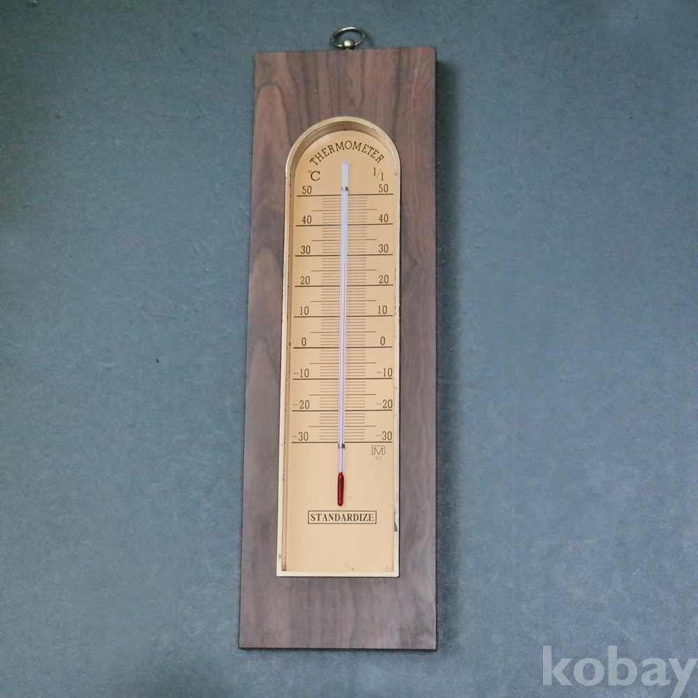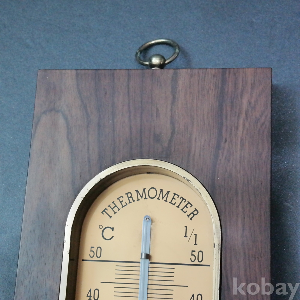 몸통이 프라스틱으로 만들어진 오래된 나뭇결문양 온도계 입니다.