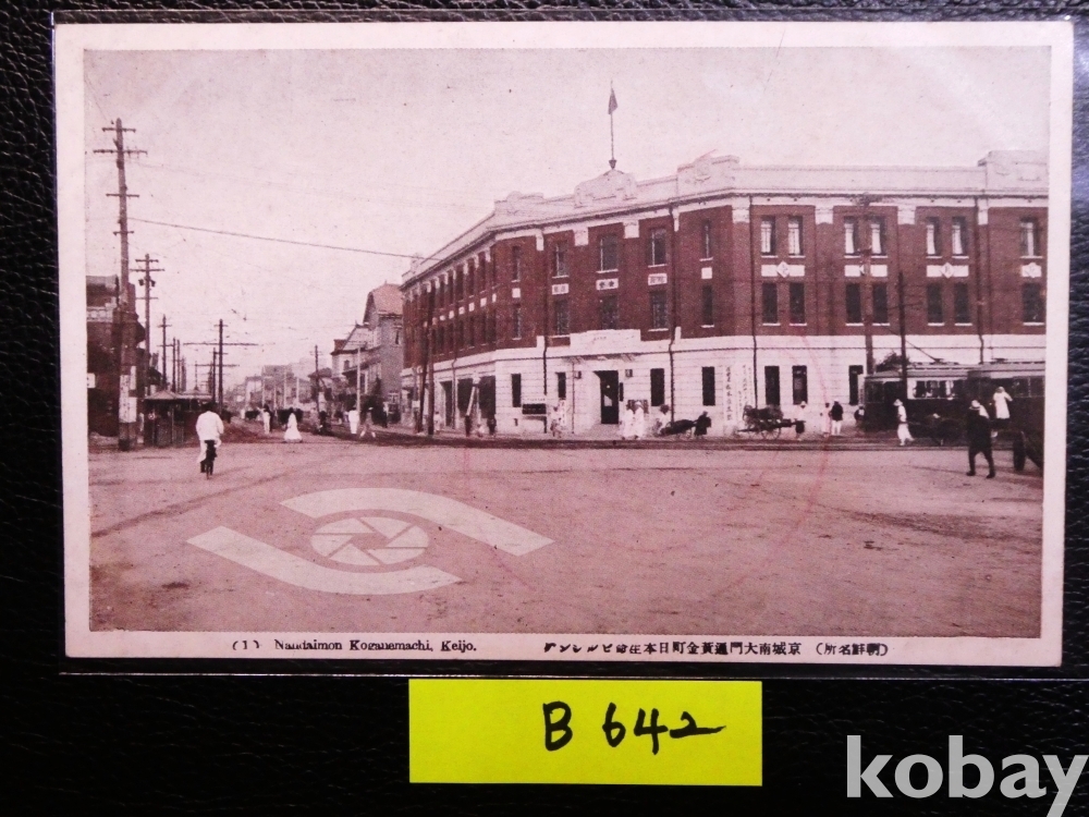 ▣근대한국엽서(진본): 경성 남대문통 황금정 일본생명빌딩 앞거리 모습과 전차, 히노데상행 발행/1매.