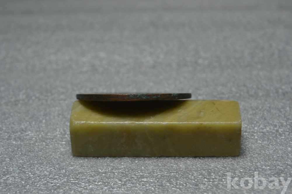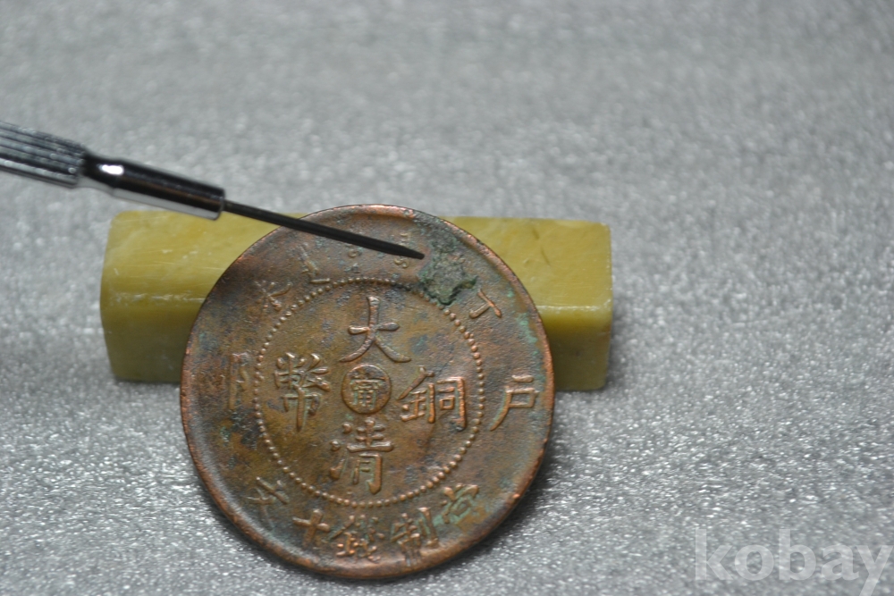 ㅡ> 대청동폐의 앞면부분을 보시면 굳은 때묻음 이물질이 일부 붙어 있습니다. (검은핀으로 가르킨 부분 2번째 사진참조)