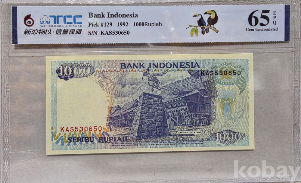 -1992년 인도네시아 1000루피아 지폐 TCC65 등급 입니다.