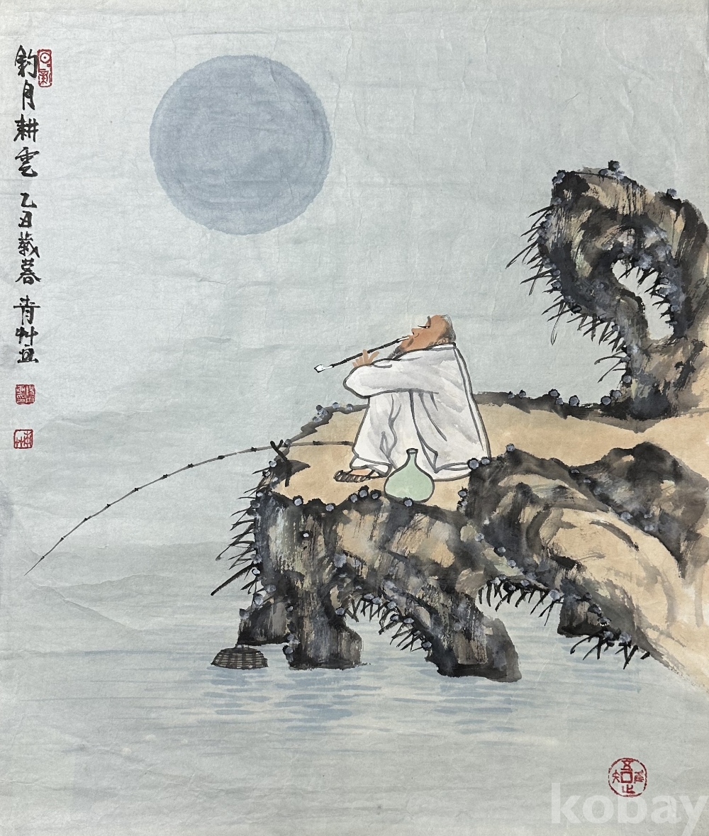 달빛이 넓게 번진 밤하늘 아래, 바위 위에 앉은 인물이 피리를 불며 고요한 물가를 바라보는 장면을 수묵과 옅은 채색으로 담아낸 작품입니다. 바위 가장자리에는 물결이 잔잔히 스며들고, 화면 우측의 굽은 노송과 거친 바위 질감이 대비를 이루며, 인물의 흰 옷자락과 달빛의 여백이 함께 호흡해 전체 분위기가 한층 맑고 서정적으로 정리됩니다. 좌측에 작가 서명과 인장이 확인되며, 화면 하단에도 낙관이 더해져 화면 구성이 단정하고 소장·전시용으로도 인상적입니다. 작품 화제에는 제작 시점을 짐작할 수 있는 ‘을축년 연말’ 표기가 있어 연대 추정에 참고가 됩니다.