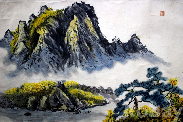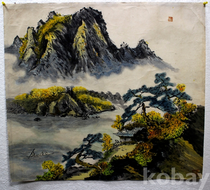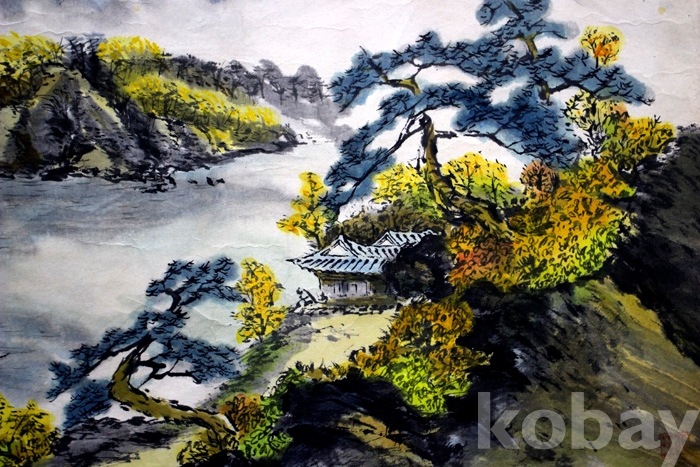 작가를 읽을 수 없는 추경산수 - 단풍에 둘러싸인 산사가 있는 강가의 풍경