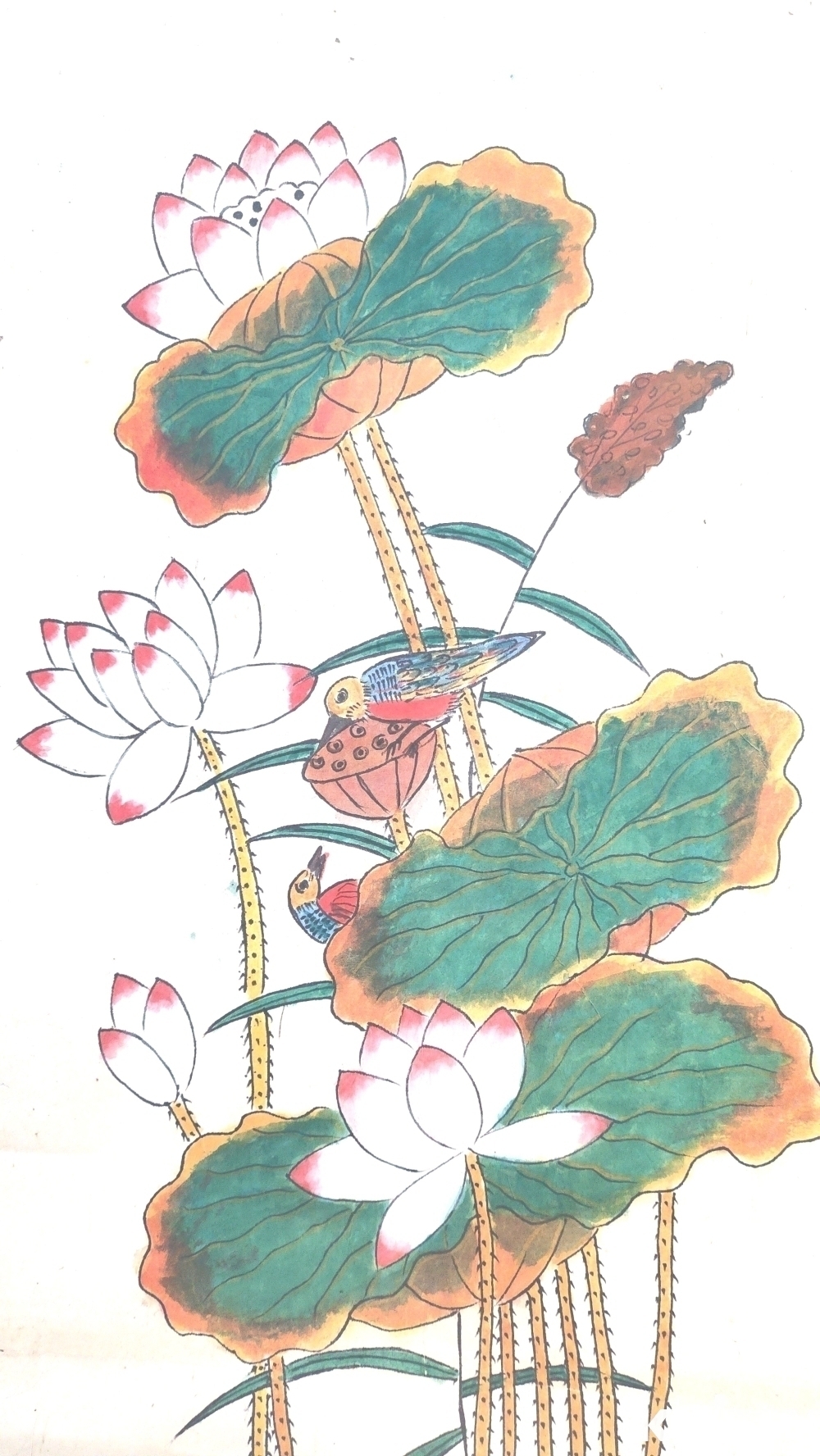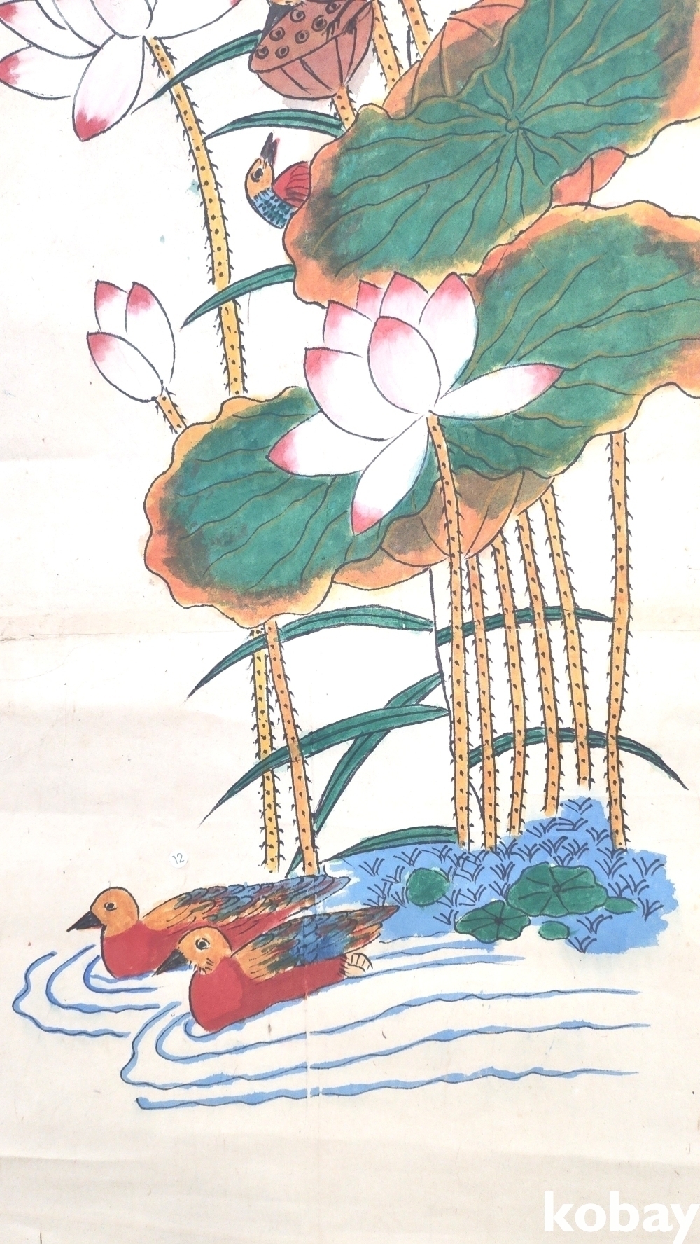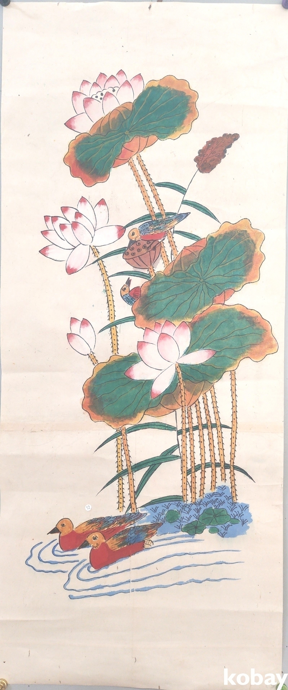 종이에 채색된 연꽃과 원앙 그림입니다,