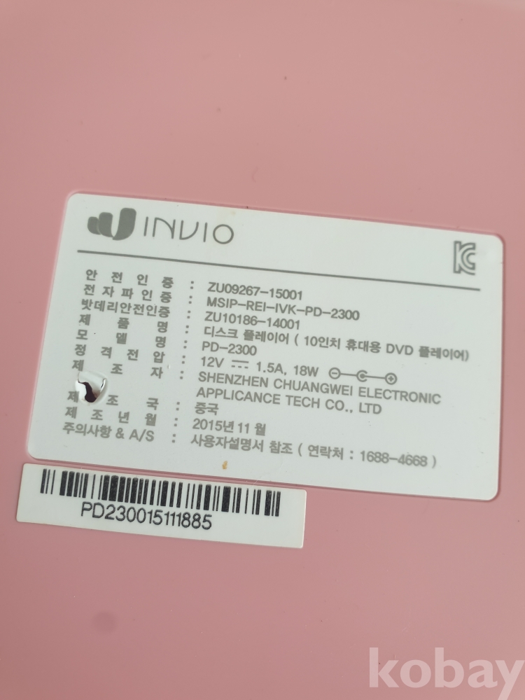 [천원경매] 3-264 인비오 휴대용 DVD 플레이어(작동확인안됨, 케이블 없음)