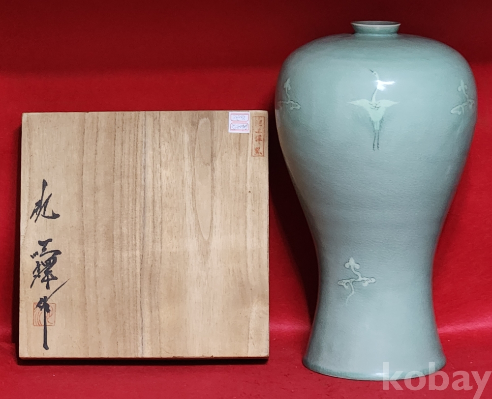 "인간문화재"도암 지순탁 흑백상감 운학문 매병 대형 37.5cm(진품보증)(작품상태최상급)(수결박스완비)퀄리티작품