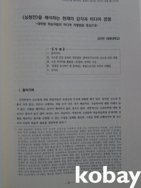 특히 “심청전”를 교육하는 세명대학 김지연 교수의 논고는교육대상자가 변화하고, 고전의 가치에 대한 접근과 평가가 달라지는현 시점에서 대학교수들이 처절하게 노력하는 것을 엿볼 수 있게 한다