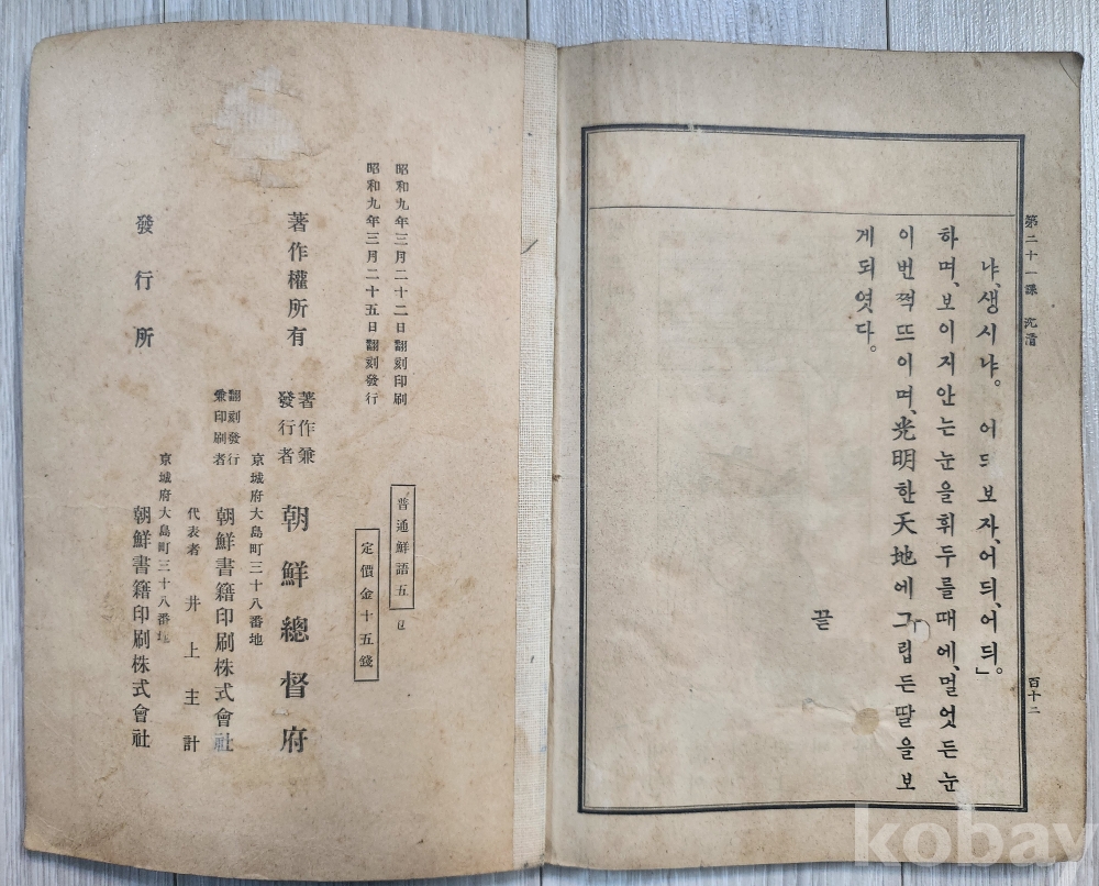 일제감정기 보통학교 교과서 조선어독본 (소화9년 1934년) 입니다 112페이지 낙질파본없이 상태 양호합니다