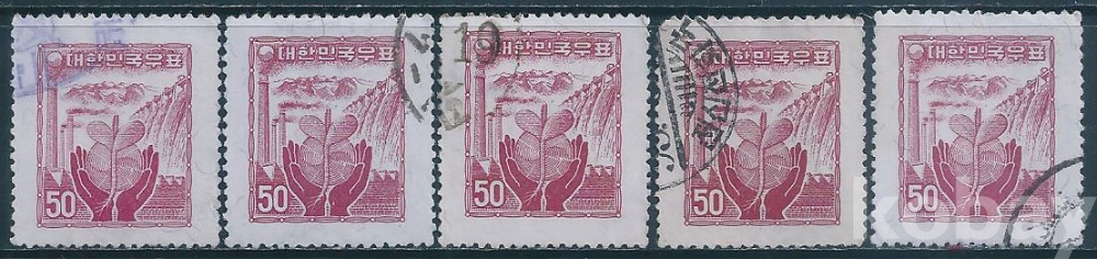 (한국우표사용제-8)1958년산업도안우정마크투문50환우표5종-사용제