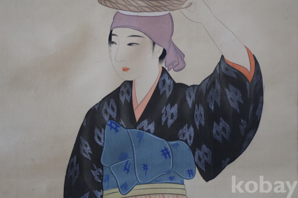 멋진 족자 임니다 바구니를 가진 미인의 모습을 표현한 화가의 혼을 가진 명화 이며 위에는 세월의 반점?이 보임니다 고급 축을 가진 1930대 전후의 명화 임니다