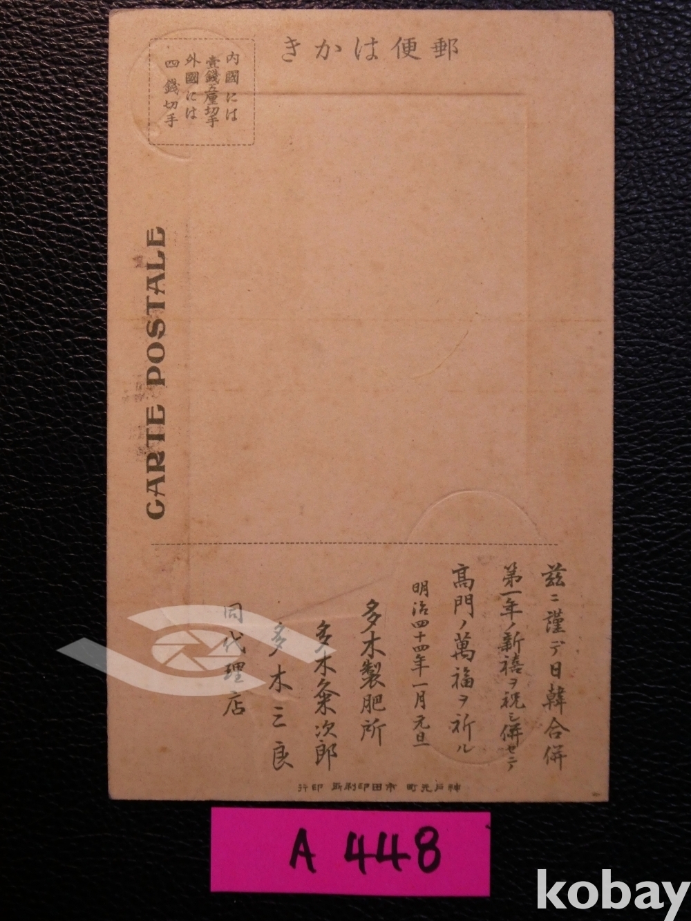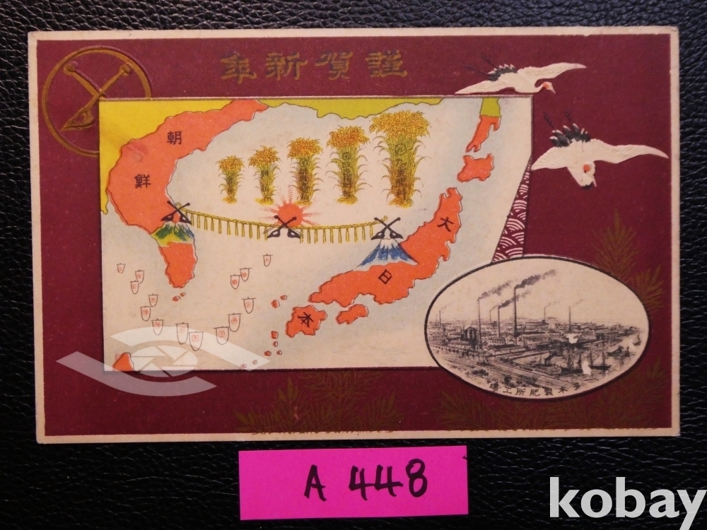 ▣근대한국엽서(진본): 1911년 한국병합(한일합방) 1주년 기념 연하장 엽서/1매/다목제비소(비료공장) 발행.