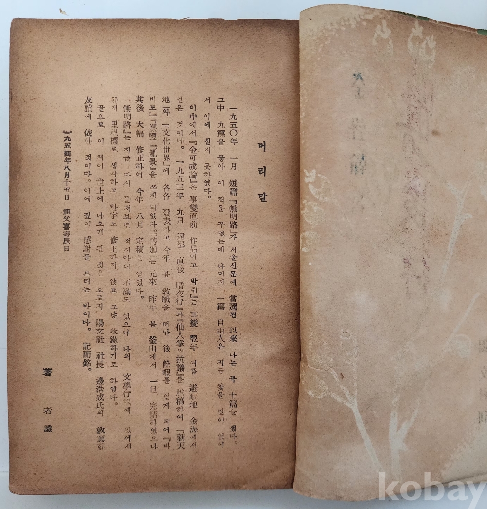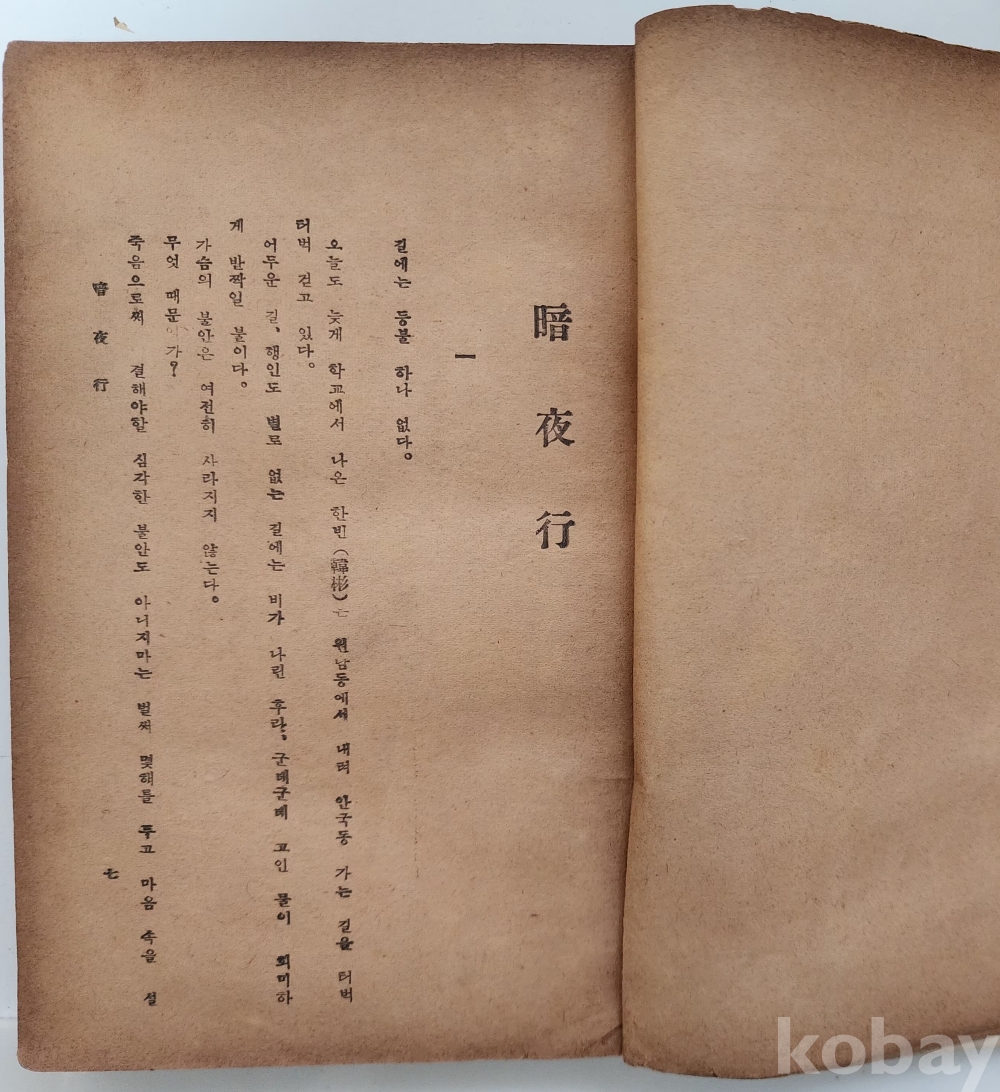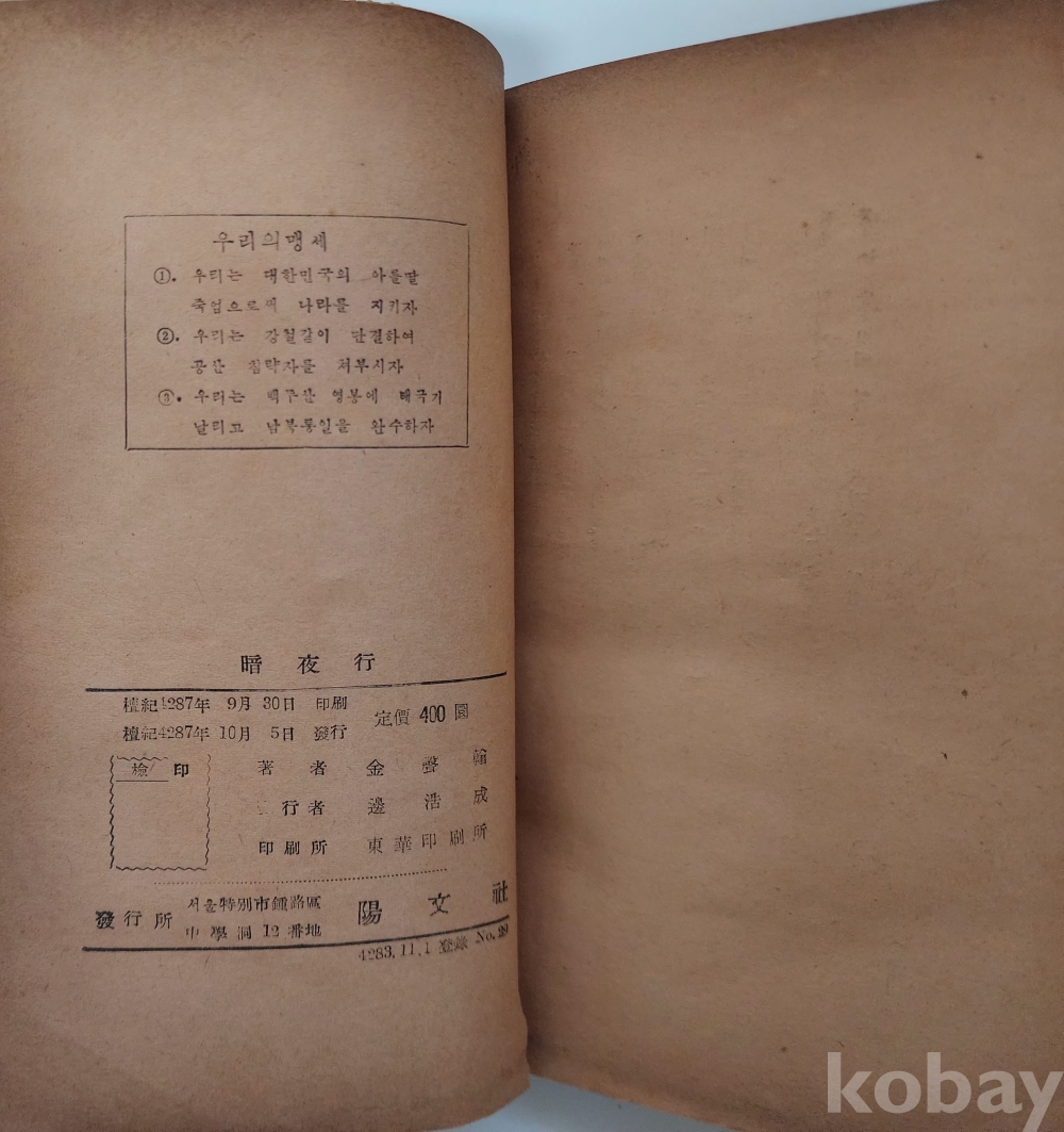 자료명/ 저자/ 발행/ 형태사항 | 『암야행 · 暗夜行』/ 김성한(金聲翰, 1919~2010) 著/ 서울: 陽文社, 檀紀4287[1954].10.5_초판본/ 313p. 모서리와 책등이 마모돼 낡았음. |