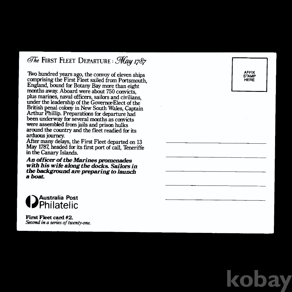 - 구성은 영국인(죄수) 이송을 위한 함선, 이송을 기다리는 죄수들, 아서 필립 선장과 부인, 이외 항구의 모습 입니다