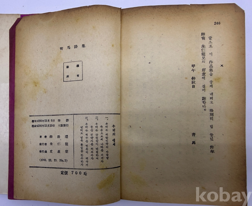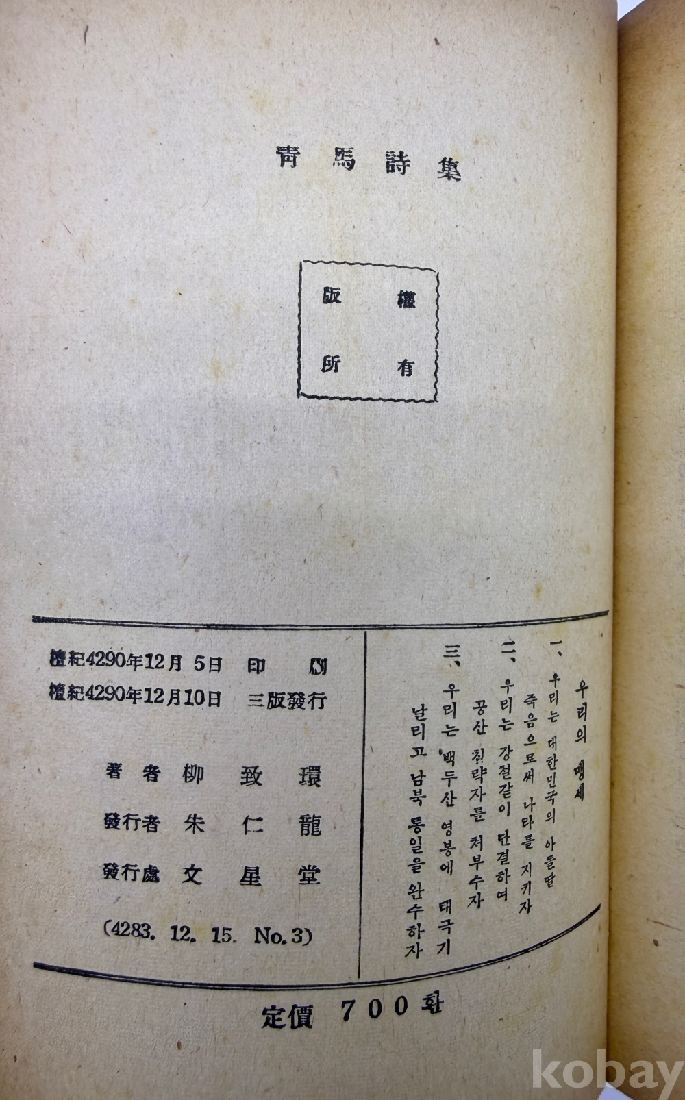 물 품 명 | <좋-았書! 2탄> [11] 1957년 발행, 유치환(柳致環) 시집 [청마시집(靑馬詩集)] 3판본 2책 일괄(동일본) | |||||