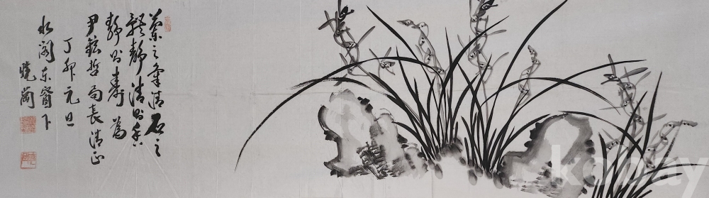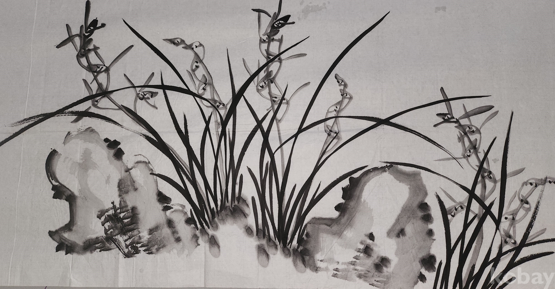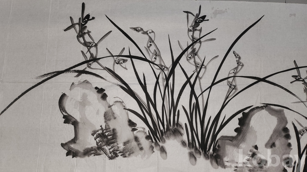 종이에 수묵으로 괴석에 난(蘭)그림입니다,