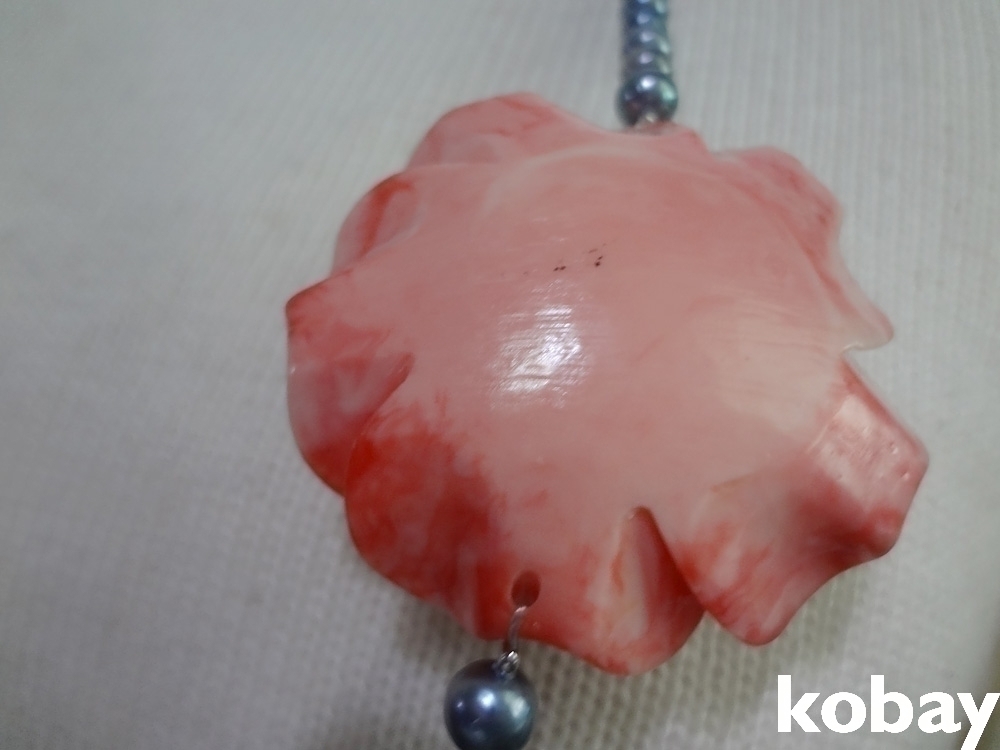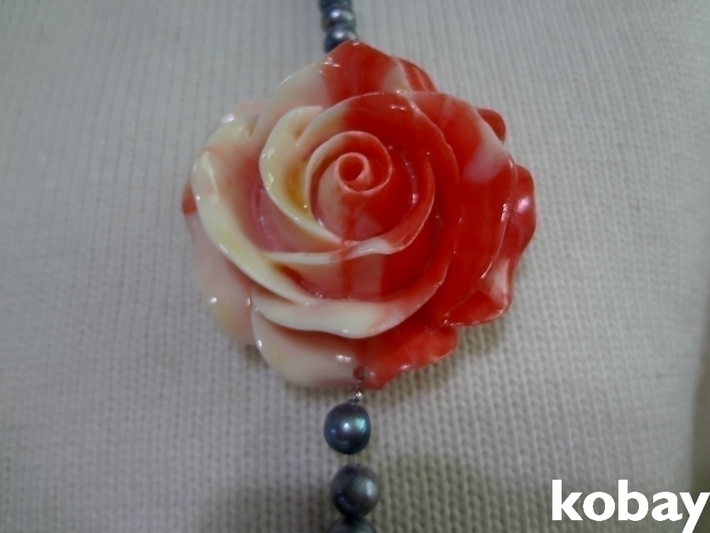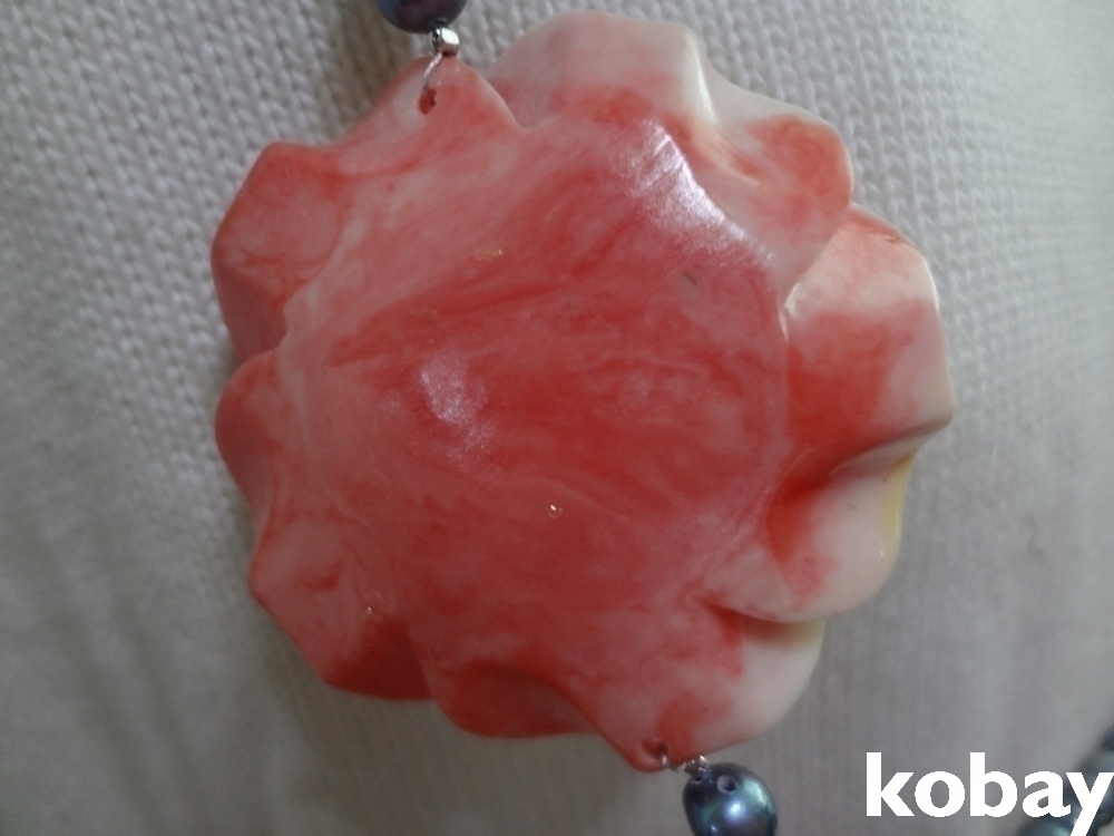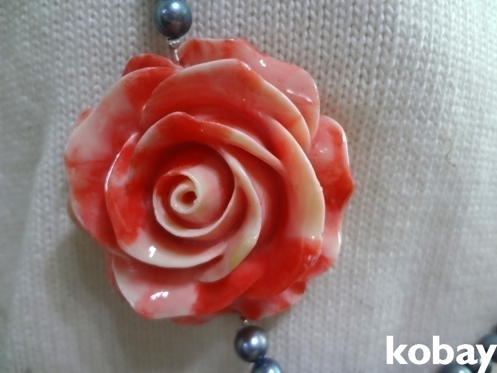 핵진주 목걸이에 마고(구운도자기) 장미가 달린 목걸이 입니다.