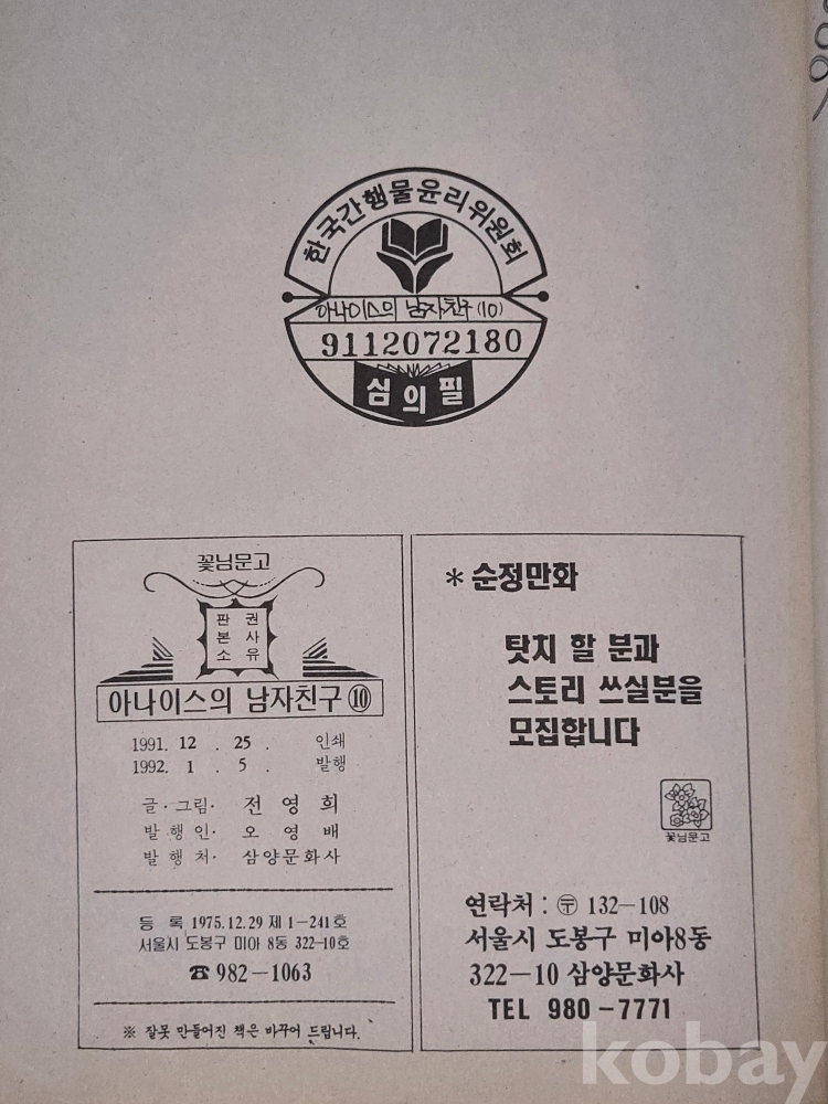 청소년 만화 == 전영희 글.그림 = 아나이스의 남자친구 10권 완결 == 1992년 발행