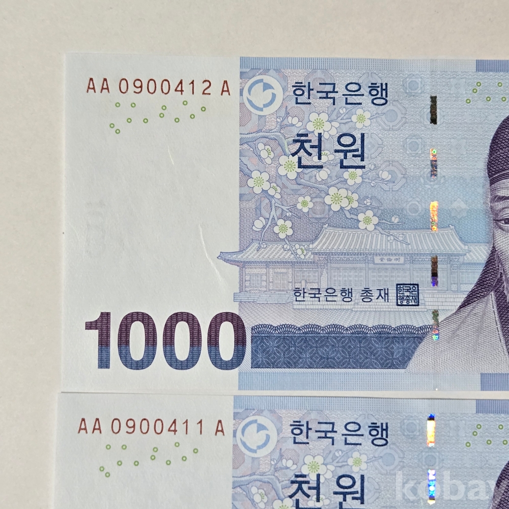 빠른번호 초판 AAA 09포인트 1000원권 연번호 2매 일괄 == 관봉에서 해체한 완전미사용