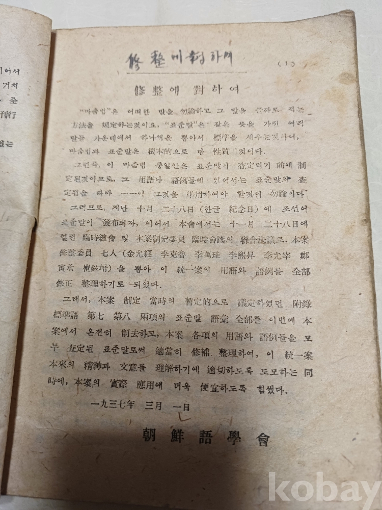상태 a급 낙장탈락 없이좋음 54p 서문 1940년 수정에대하여 1937년 한글제487회 기념일 조선 어학회 홀소리 등등 많은 볼 내용이 있습니다