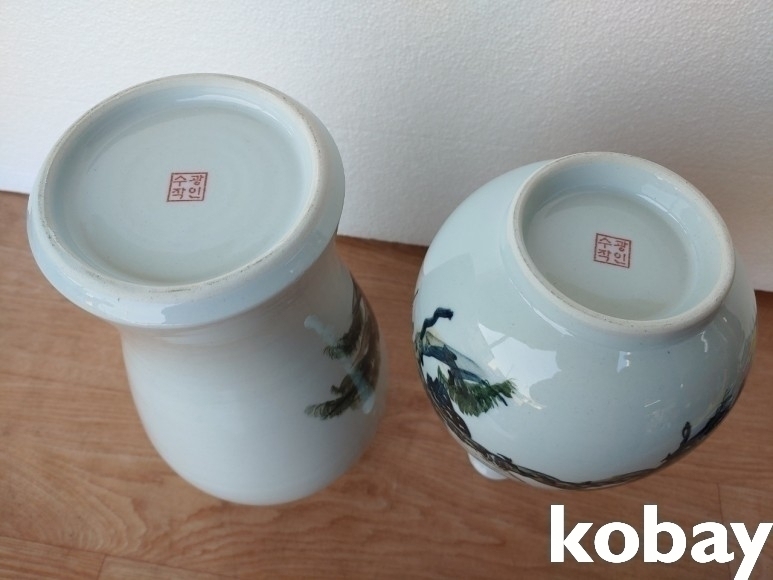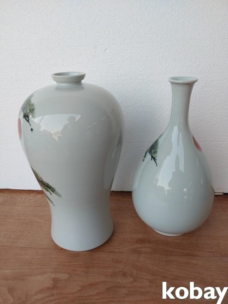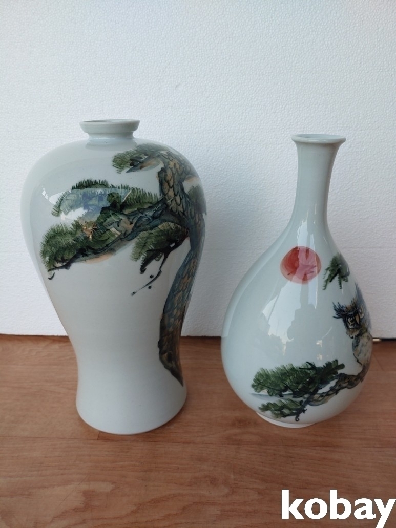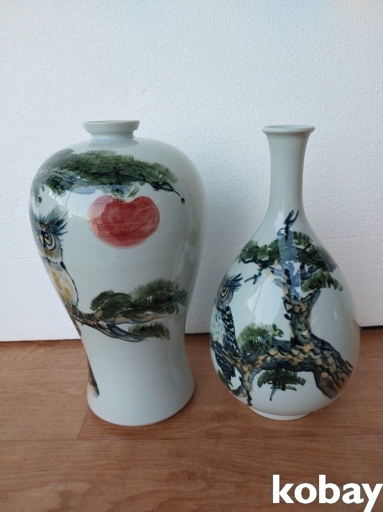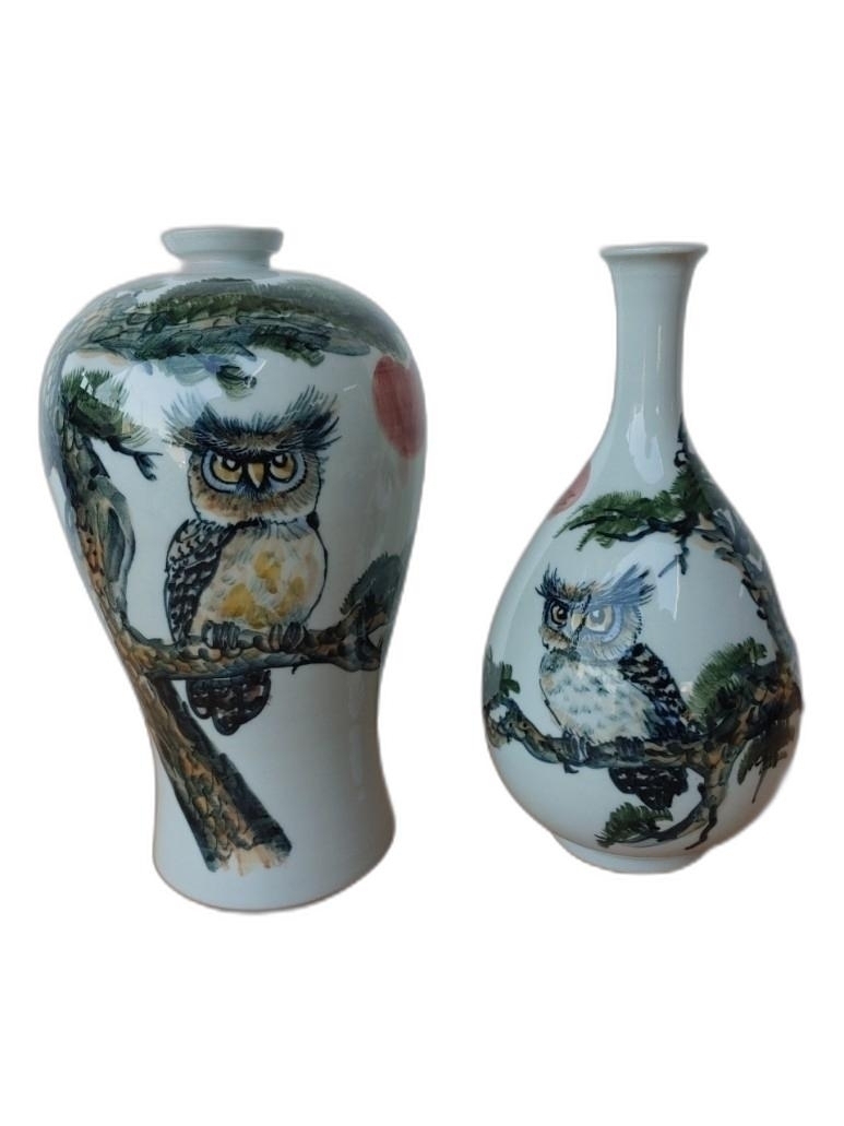 부엉이 그림이 있는 주병, 매병 도자기 셋트 입니다.