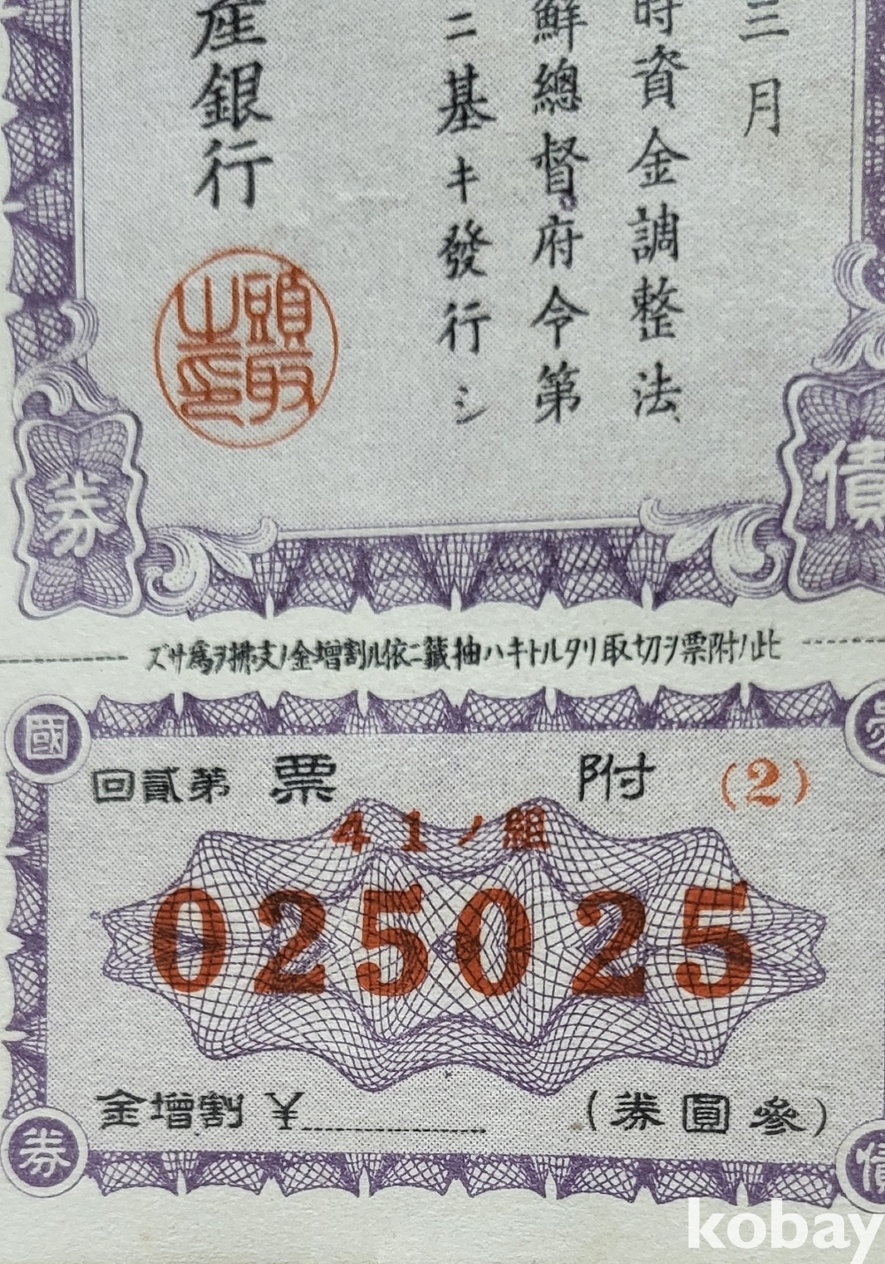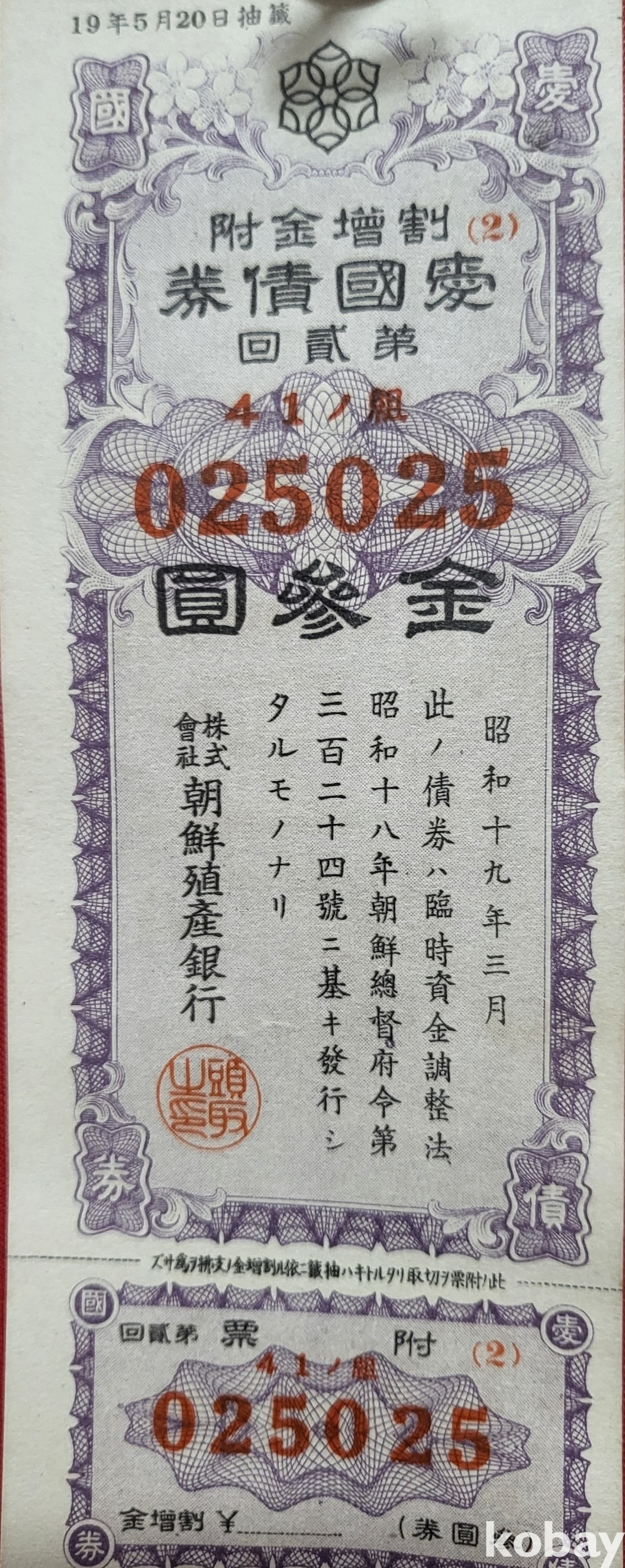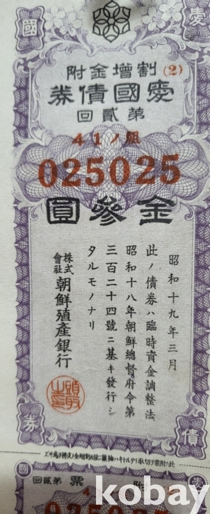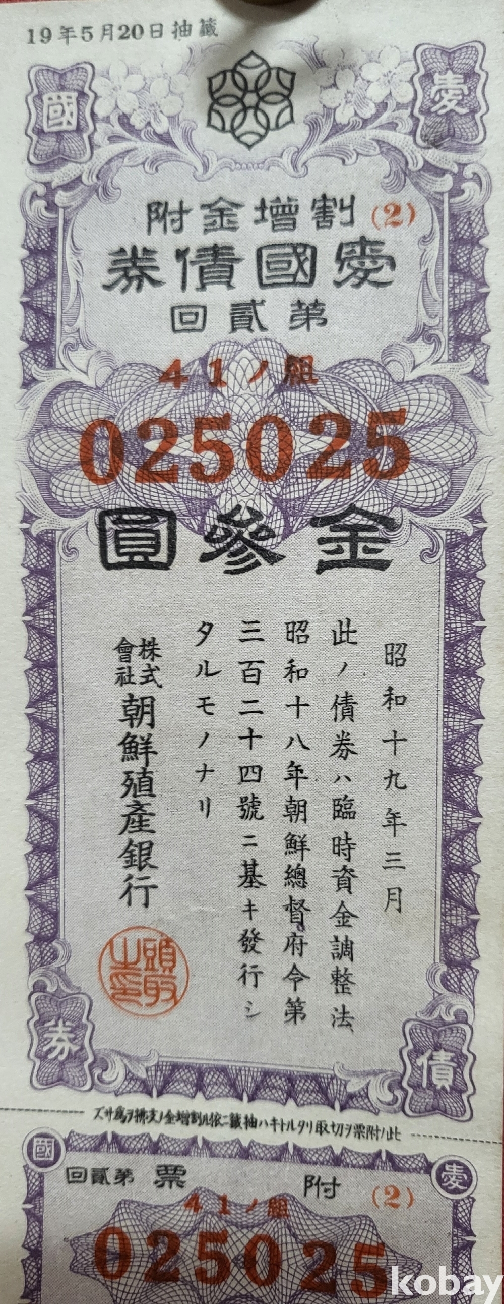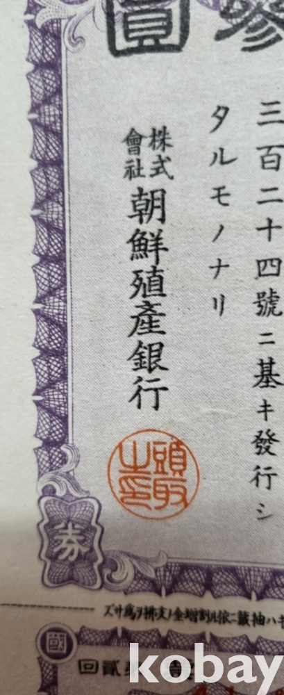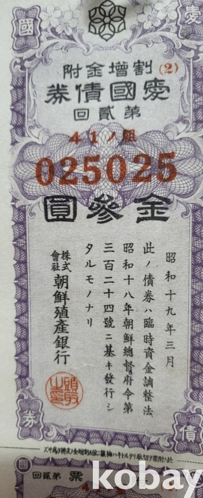 주식회사 조선 직산은행 소하19년(1943년) 발행된 할증금부(割增金附)입니다,