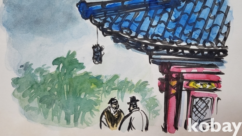 물과 먹으로 만 직접 그려진 수묵화 삽화입니다,