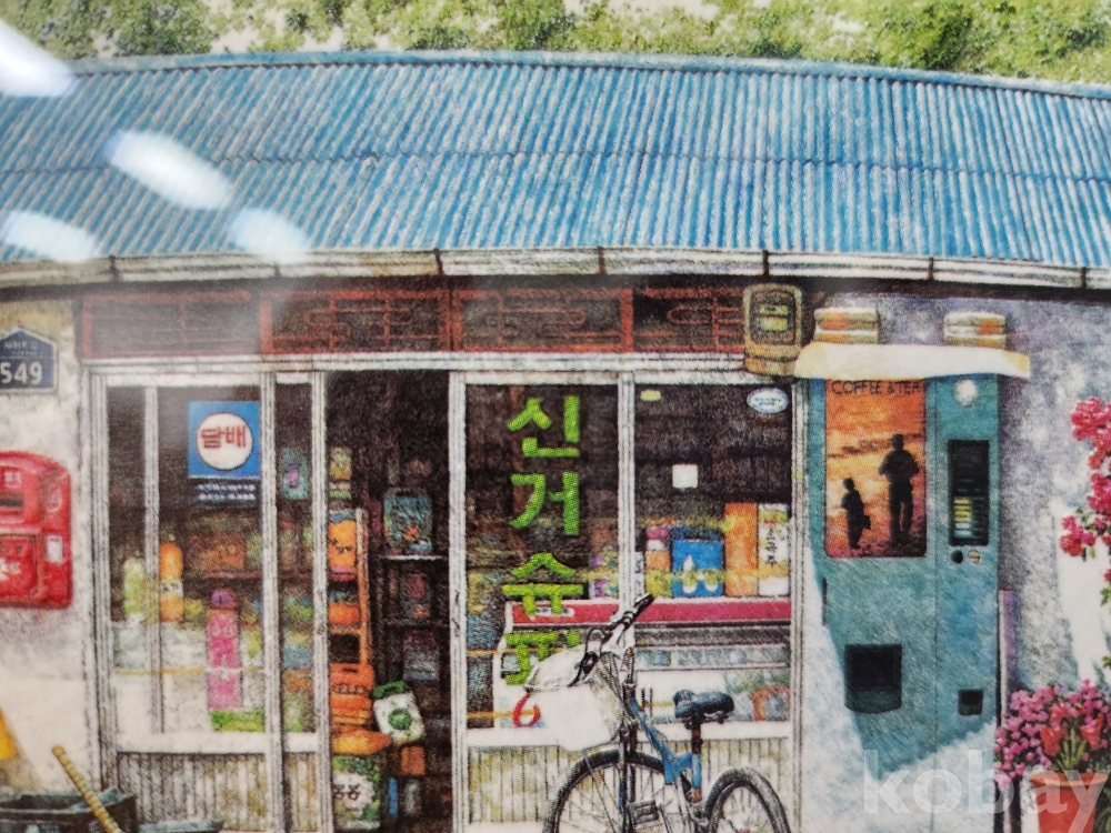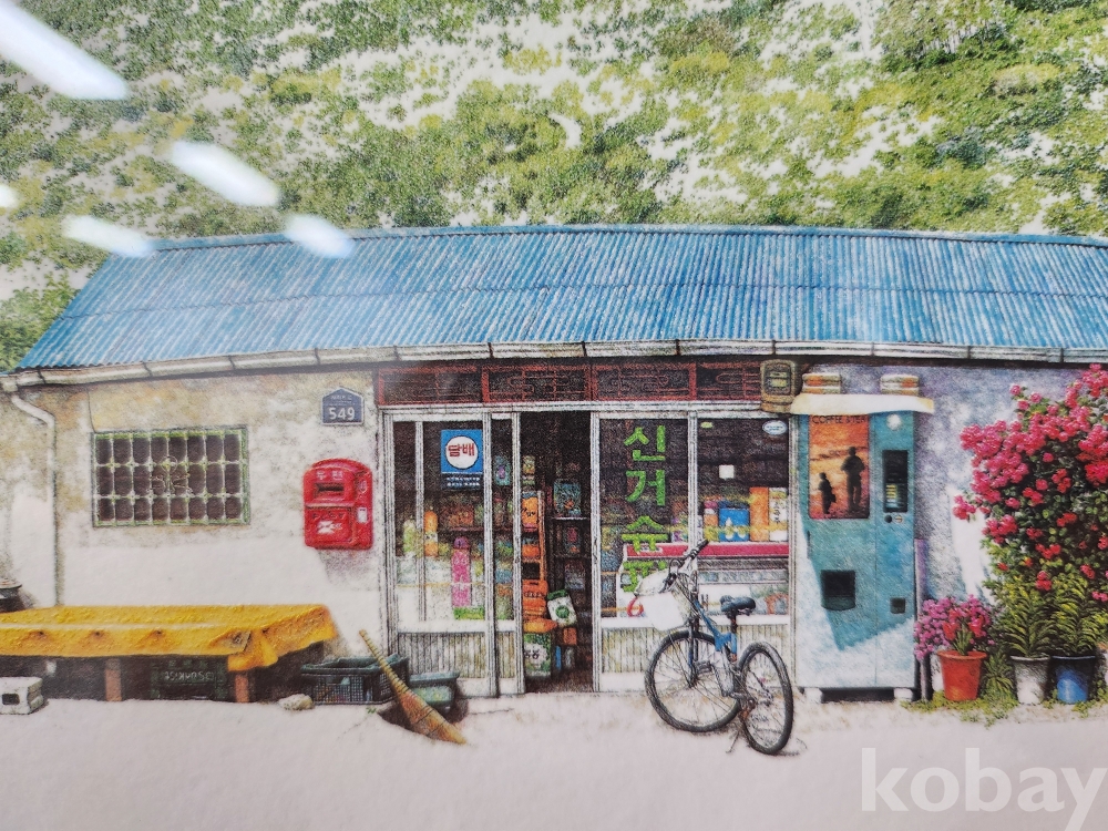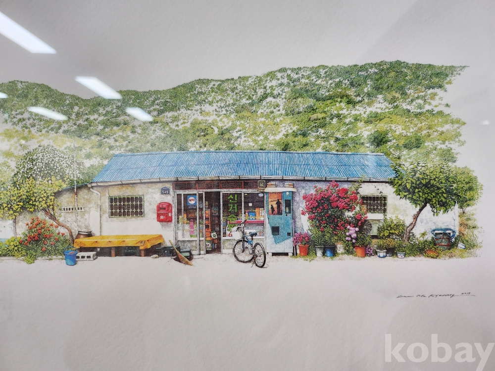 작품 설명: 화면 중앙에 길게 펼쳐진 단층 상가 건물이 수평 구도로 배치돼 있고, 파란 지붕 아래 상점 간판과 출입문, 우편함, 자전거 등이 세밀하게 표현돼 있다. 건물 전면에는 화분과 화초가 배치돼 있으며, 배경에는 완만한 산 능선이 이어진다. 여백을 넓게 둔 화면 구성 속에서 상가 건물의 형태와 주변 사물이 또렷하게 드러난다.