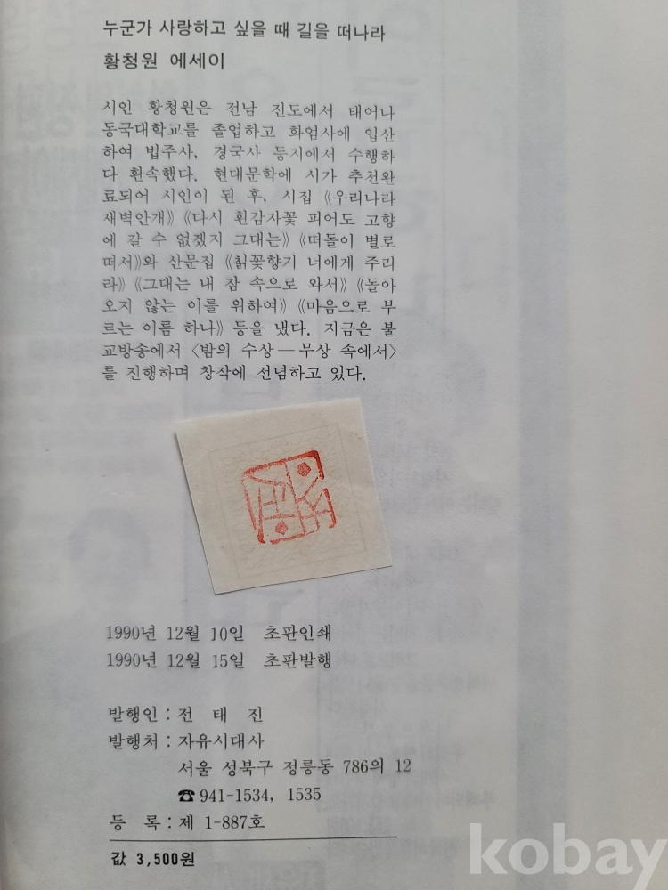 1990년 발간한 에세이 『누군가 사랑하고 싶을 때 길을 떠나라』