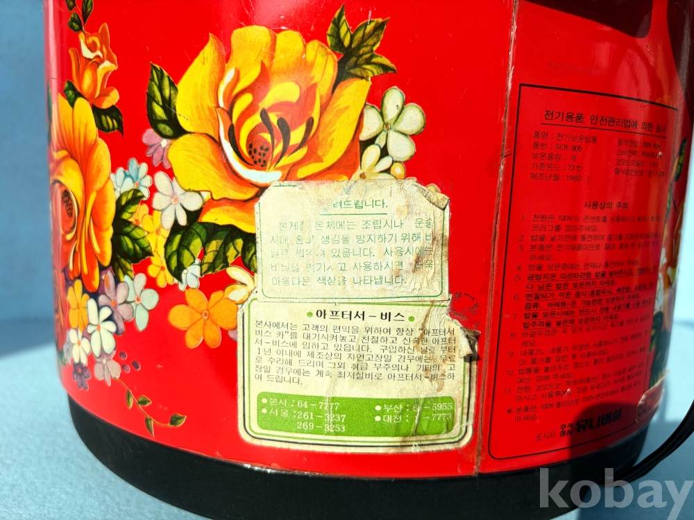 1980년에 생산된 초창기 모델로, 후면 라벨에는 당시의 전기용품 안전관리법에 의한 표시와 전국 AS 센터 정보가 고스란히 남아 있습니다.