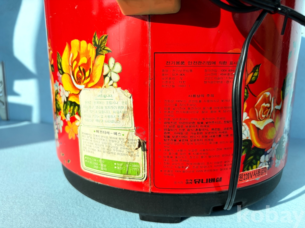 특히 '220V 사용금지'라는 붉은색 경고 스티커는 승압 공사가 한창이던 당시의 시대상을 잘 보여줍니다.