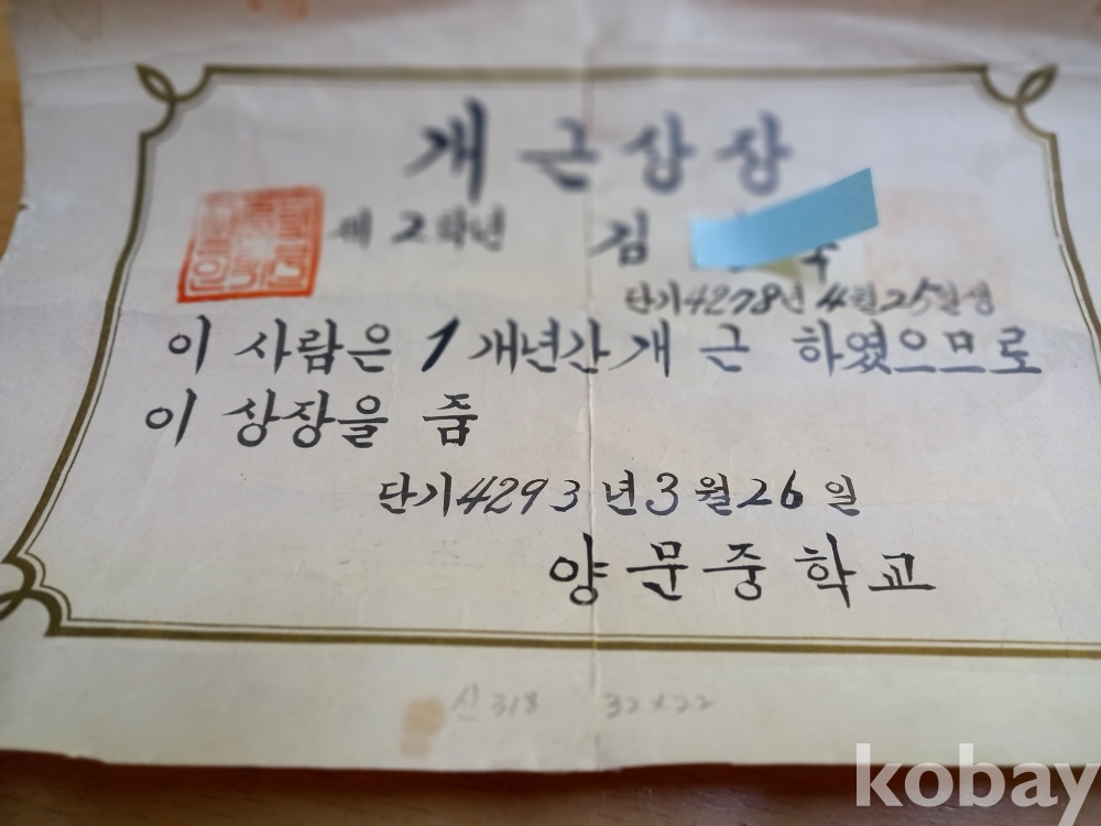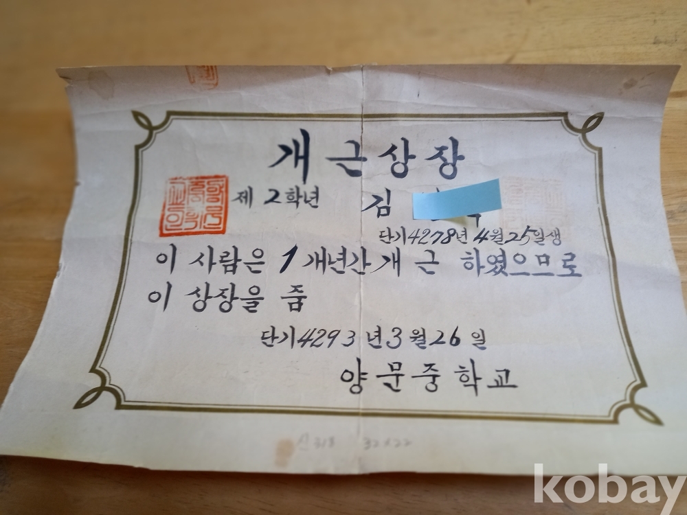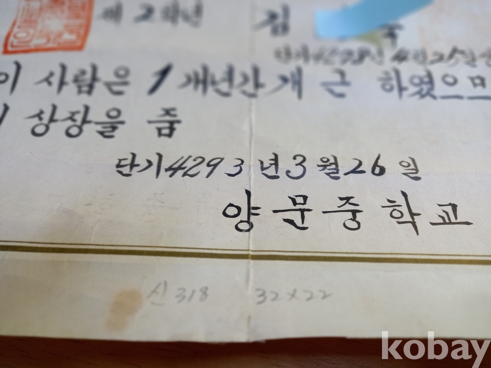 신 318) 양문중학교 개근상장 4293년