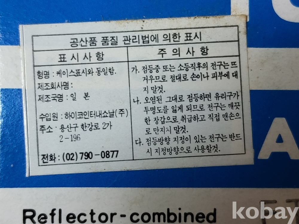 *일본산 램프: 수입윈의 스티커(수입원,하이코 인터내셔널,주)가 붙어 있으며고 제조사는 'INDUSTRIAL CO., LTD JAPAN'이고 램프의 지름과 높이 3.5cm이고 하단에는검은 영문체의 'FUJI- FTD 12V20W'의 영문이 찍혀 있고 두개의 침봉이 꽂혀 있는 작고 앙증맞은 모습입니다.