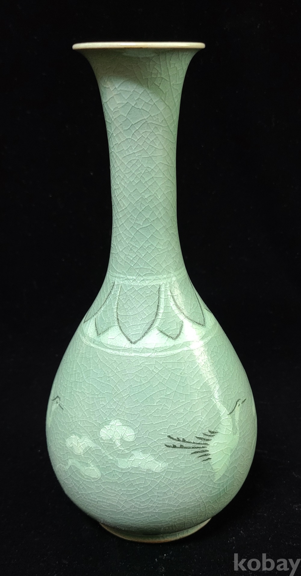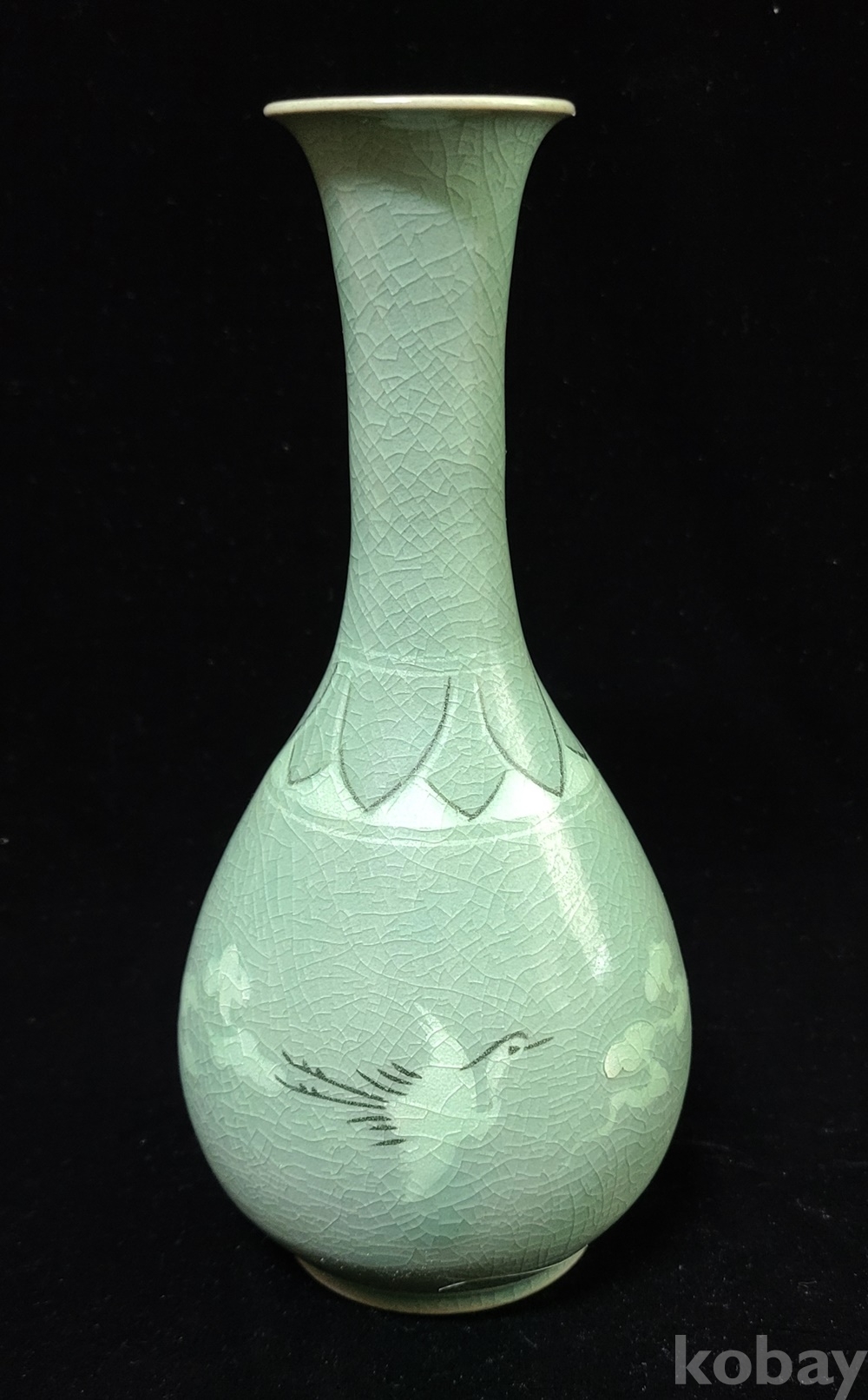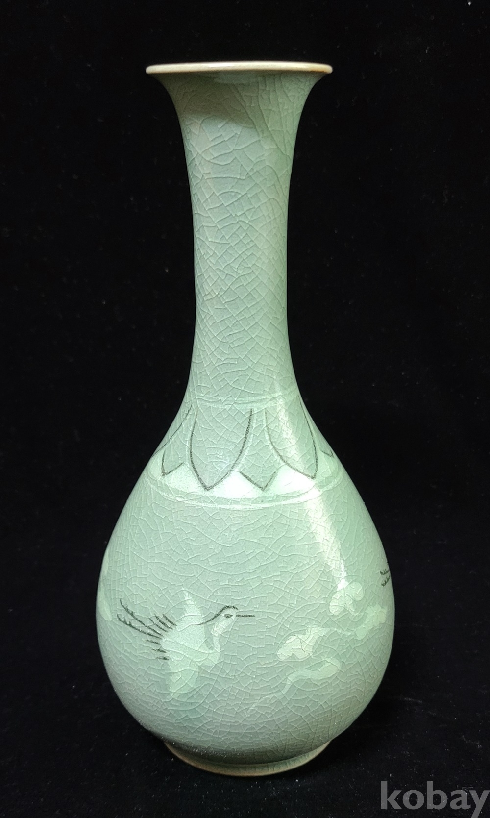 인간문화재 지순탁 池順鐸(1912-1993) 선생님 작 청자 흑백상감 운학문 주병으로 굽에 “池順鐸作” 수결 되고 형태 바르며 상태 완벽합니다.