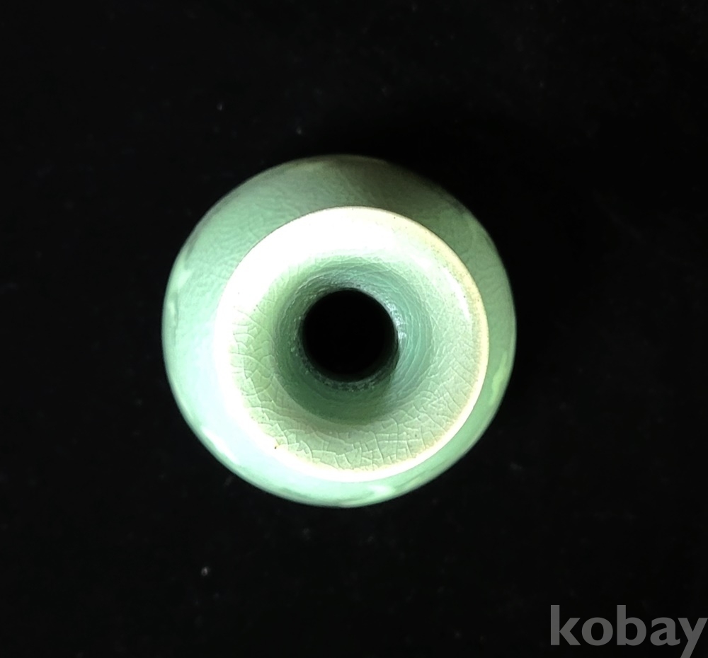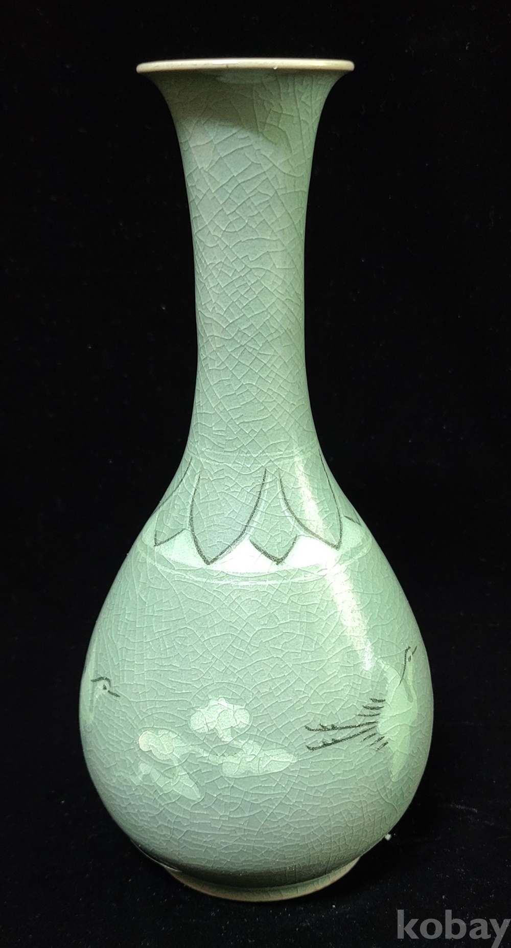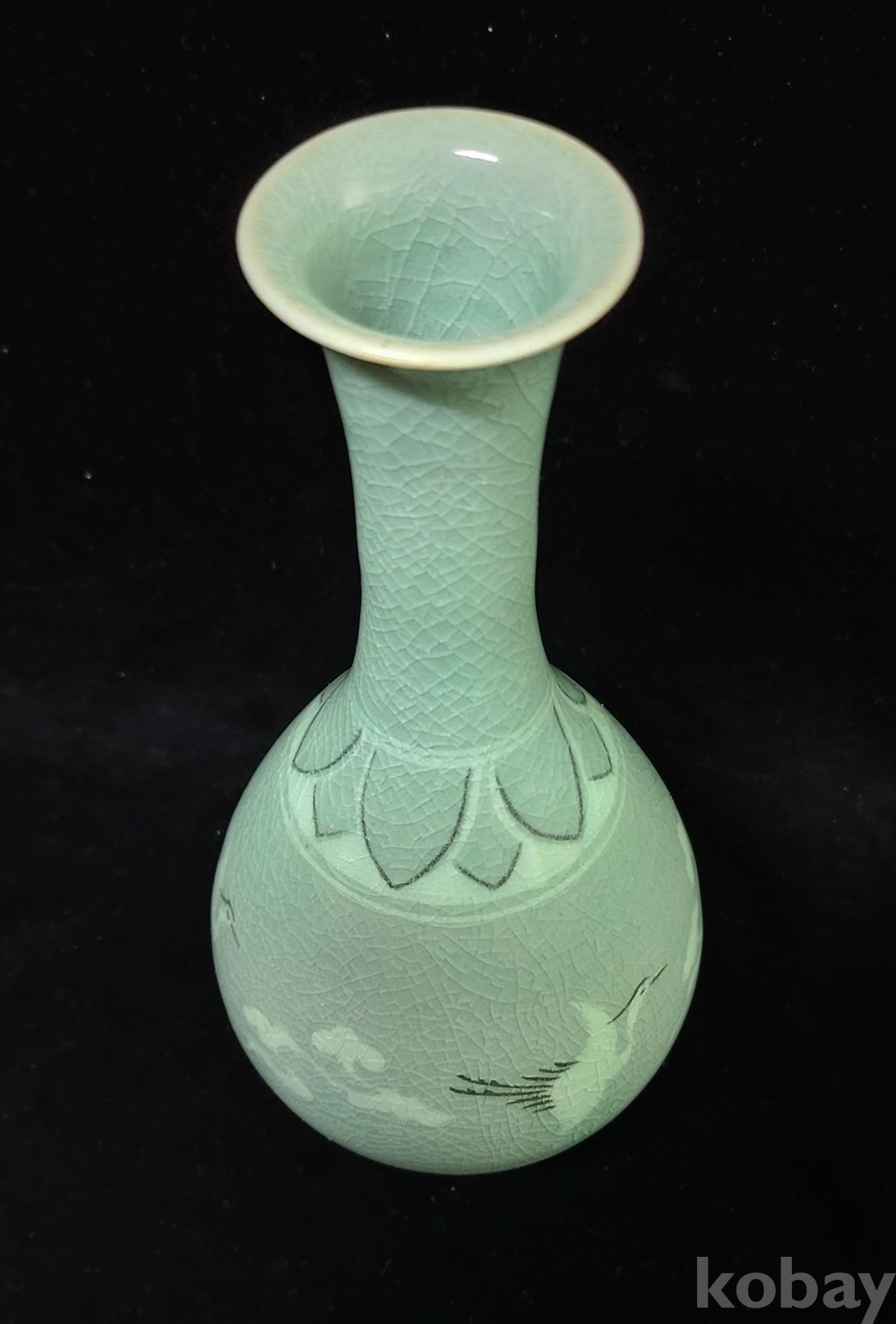 인간문화재 지순탁 池順鐸(1912-1993) 선생님 작 청자 흑백상감 운학문 주병으로 굽에 “池順鐸作” 수결 되고 형태 바르며 상태 완벽합니다.