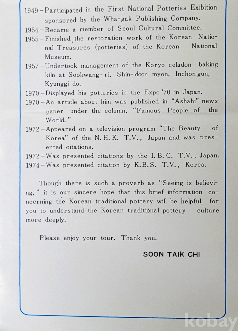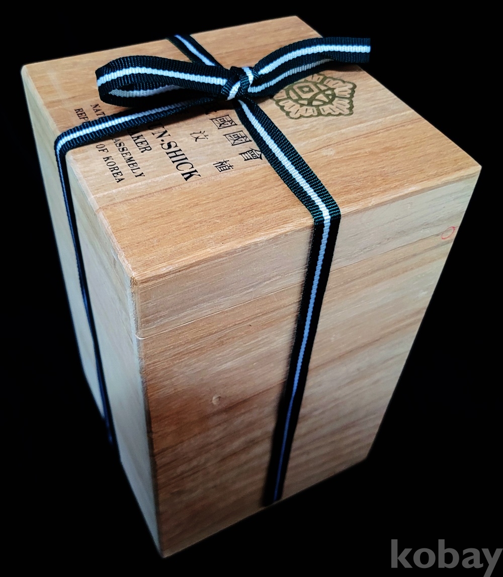 주병 굽에 “70TH INTER-PARLLAMENTARY CONFERENCE 1983 SEOUL KOREA 池順鐸 作” 박스에 “大韓民國國會 議長 蔡汶植 CHAE MUN-SHICK SPEAKER NATIONAL ASSEMBLY REFUBLIC OF KOREA” 인쇄되고 지순탁 선생님의 영문 이력표(6P)가 있습니다.
