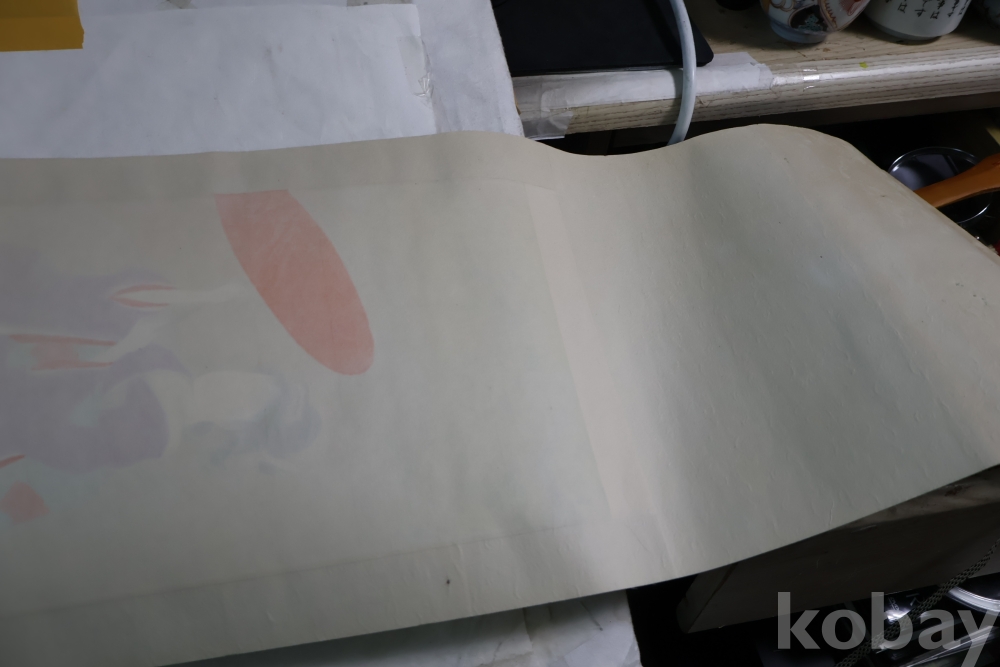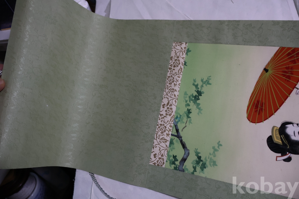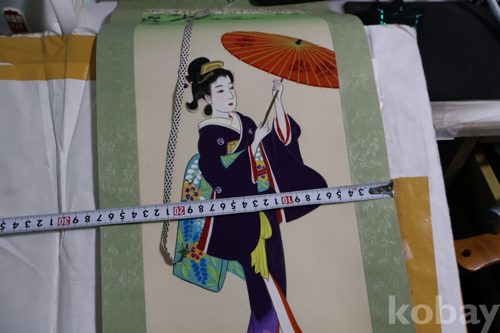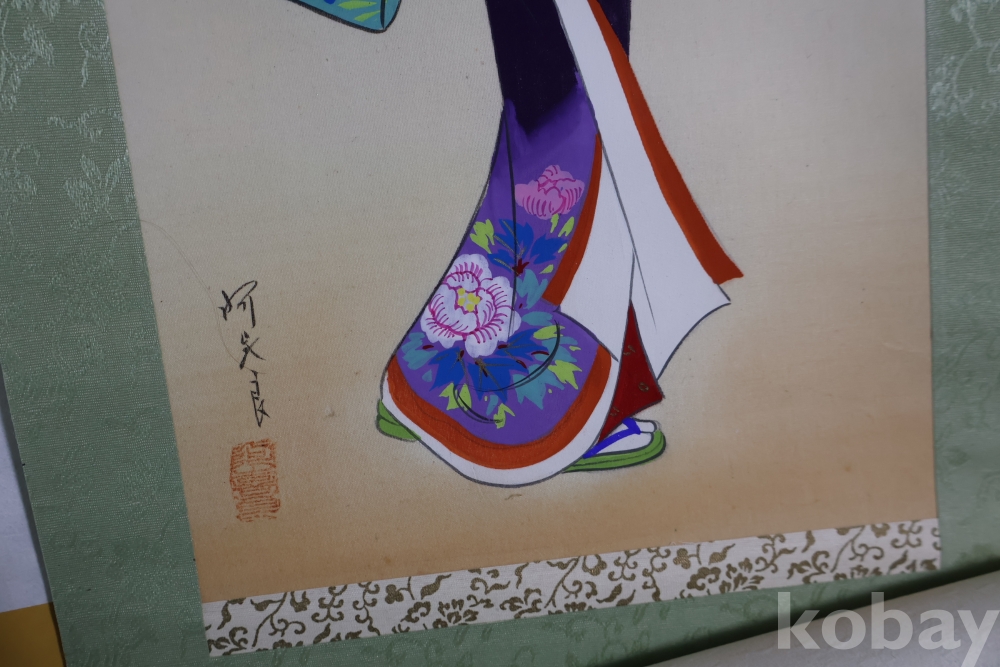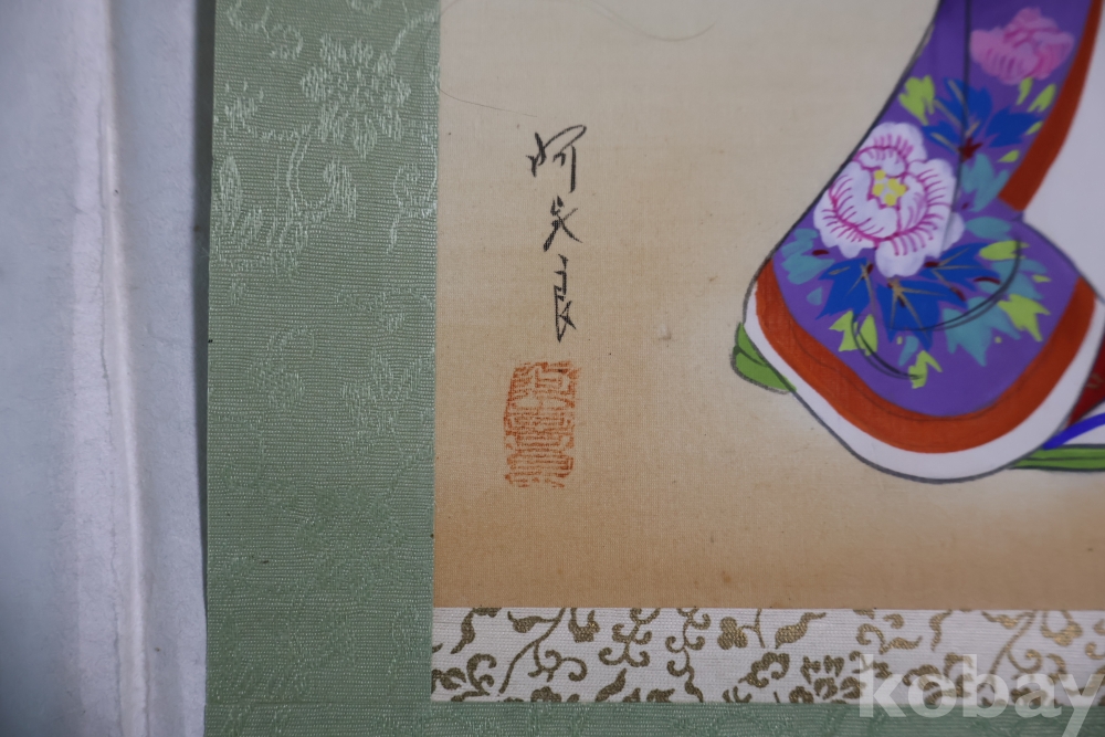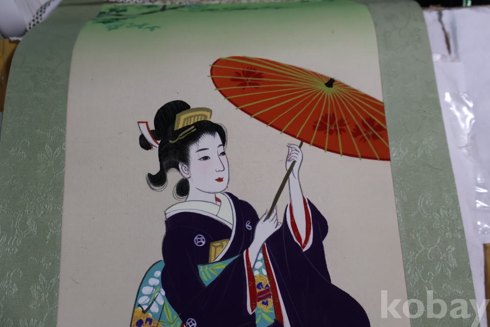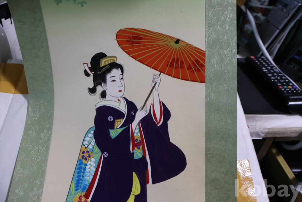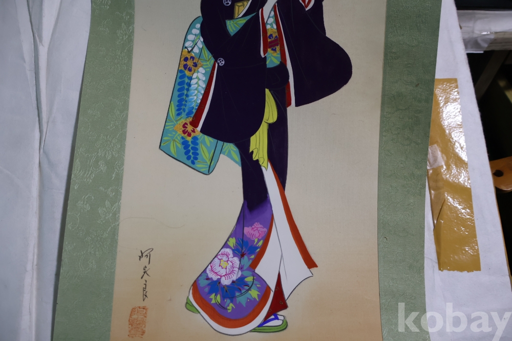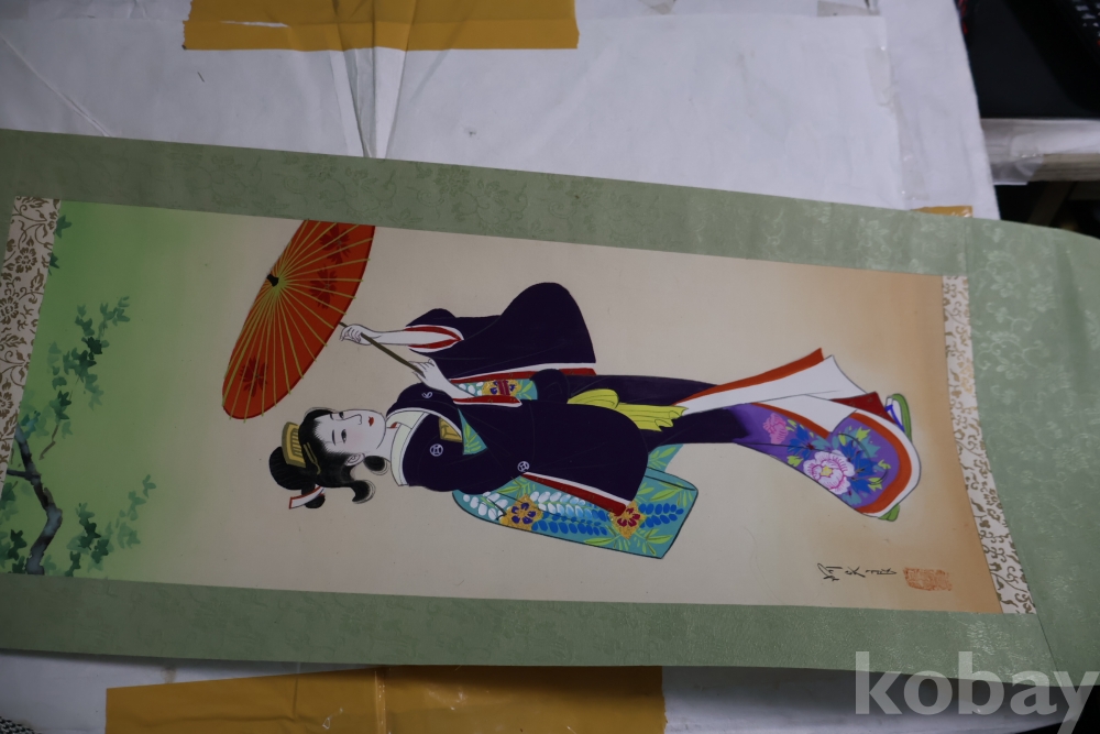 일본 게이샤 비단 족자 이며 화가의 낙관이 보이는 1950대 의 명화 임니다 길이는 96 임니다