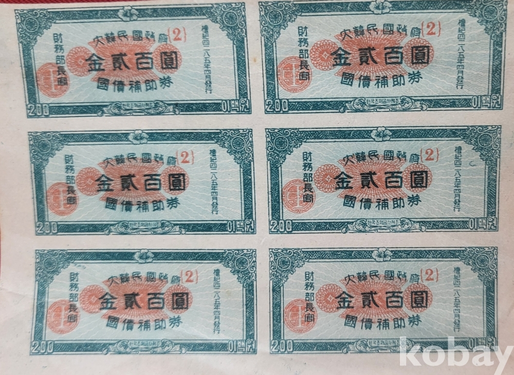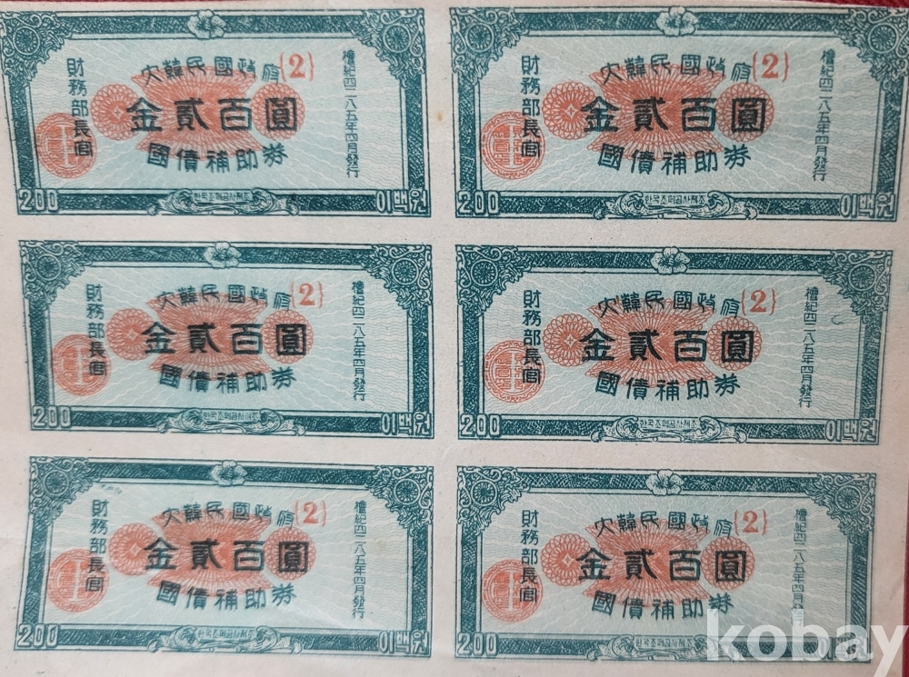 1952년( 단기4285년 ) 한국조폐공사 제조 재무부장관 발행한 이표채(利票債) 6장일괄입니다,