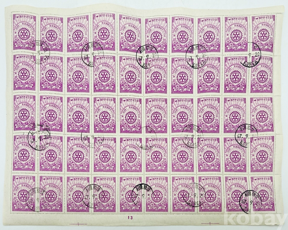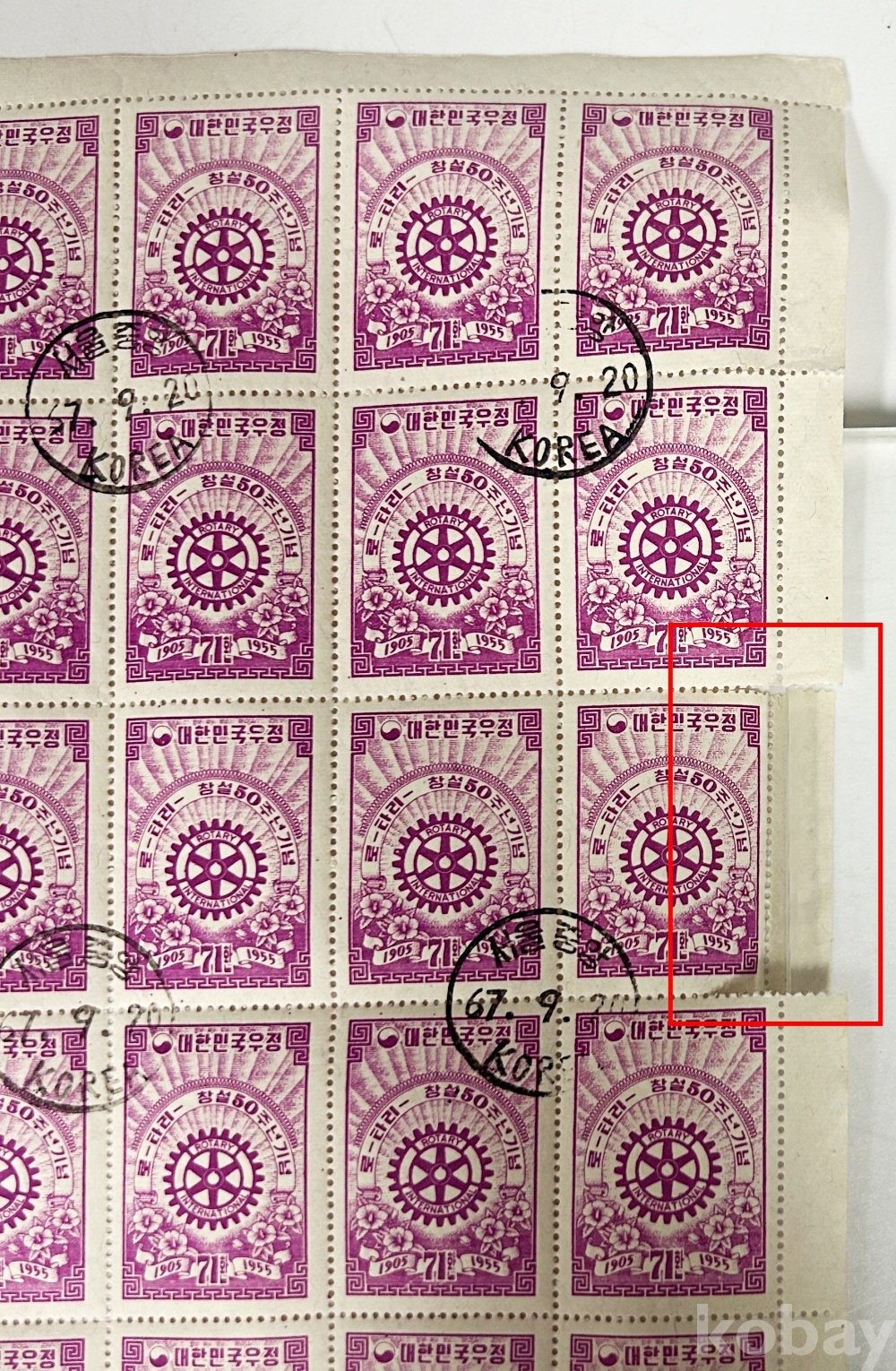 상품 설명 | 1955년 발행한 로타리 창설 50주년 71환 기념 우표 전지이다. 사용제(주문소인), 1967.9.20. | ||