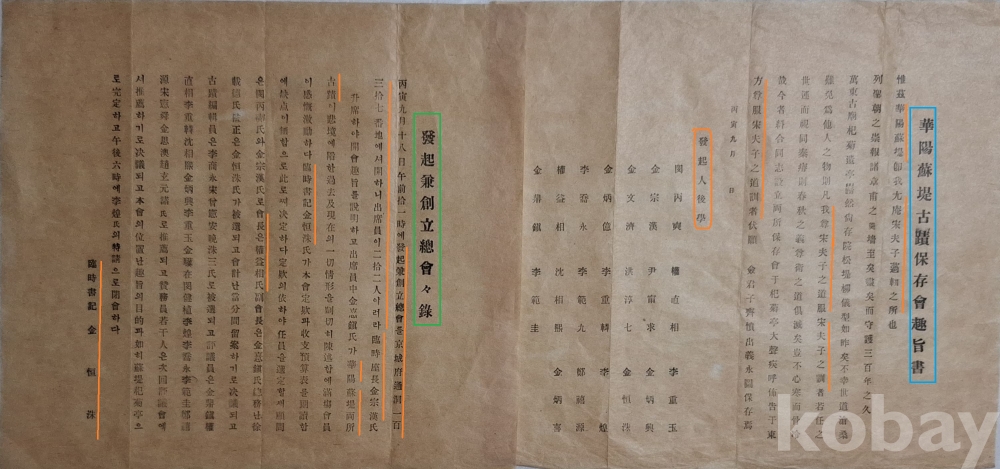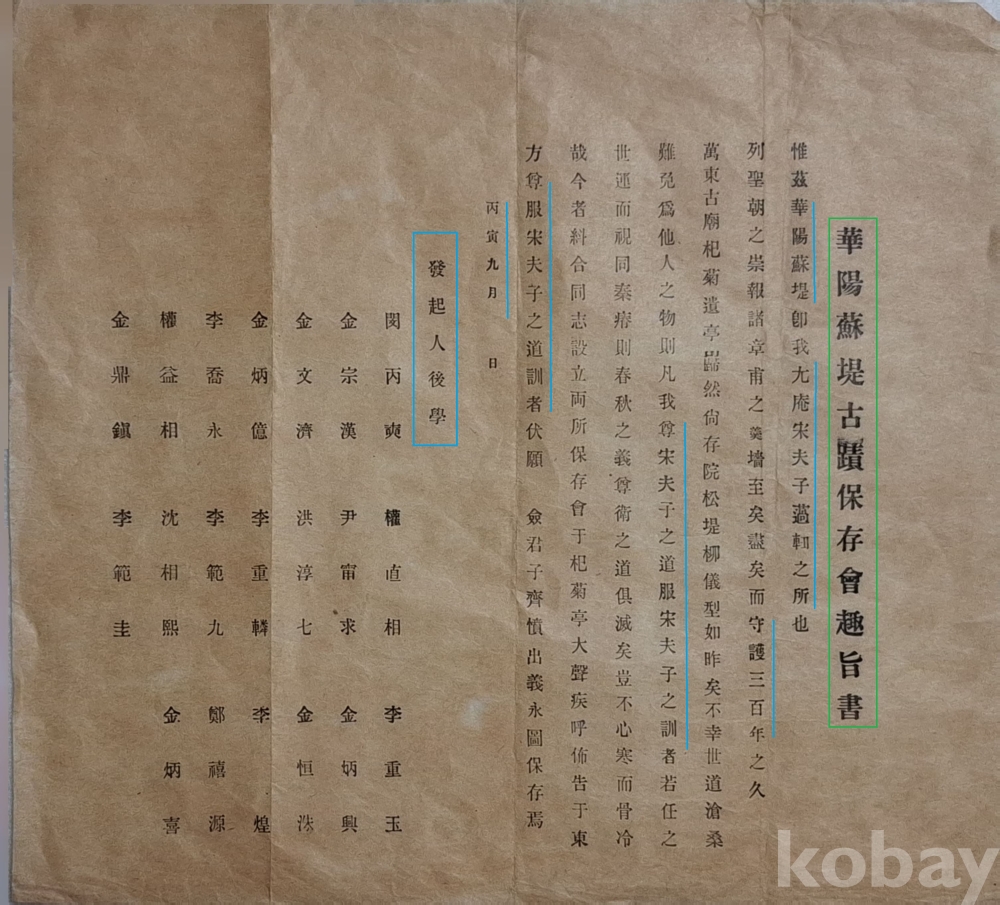 괴산 화양동(華陽洞)과 대전 소제(蘇堤)의 유적을 보존하기 위해 설립한 보존회의 취지서이다.