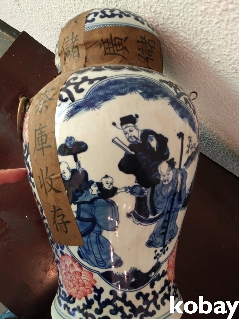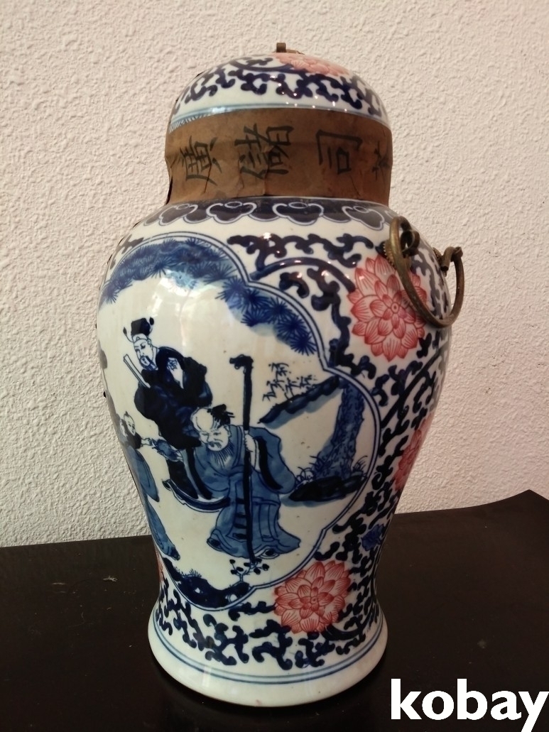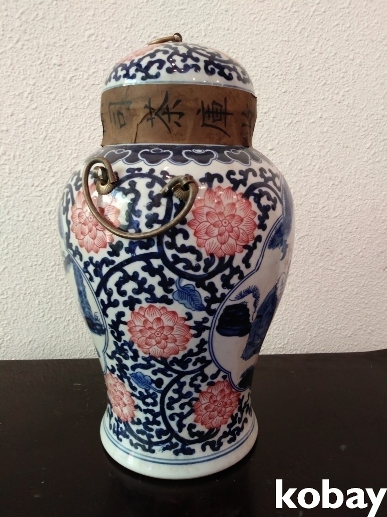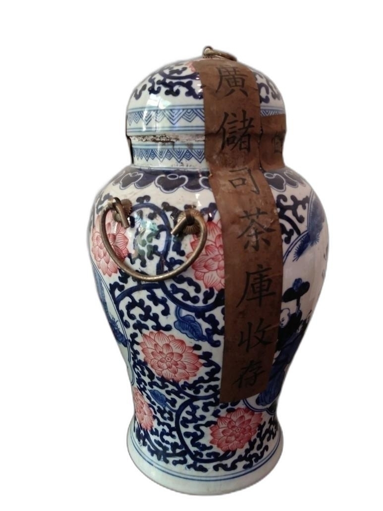 인물과 연꽃 문양이 있는 보이차 도자기 입니다.