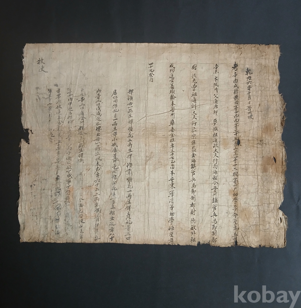 3. 지방 통치 체제의 흔적: 문서 상단에 적힌 '건륭 6년'이라는 청나라 연호와 '진주수(晉州收)'라는 문구는 조선 후기 지방 행정 관청에서 호적 정보를 어떻게 수집하고 관리했는지 보여주는 실물 사료입니다.