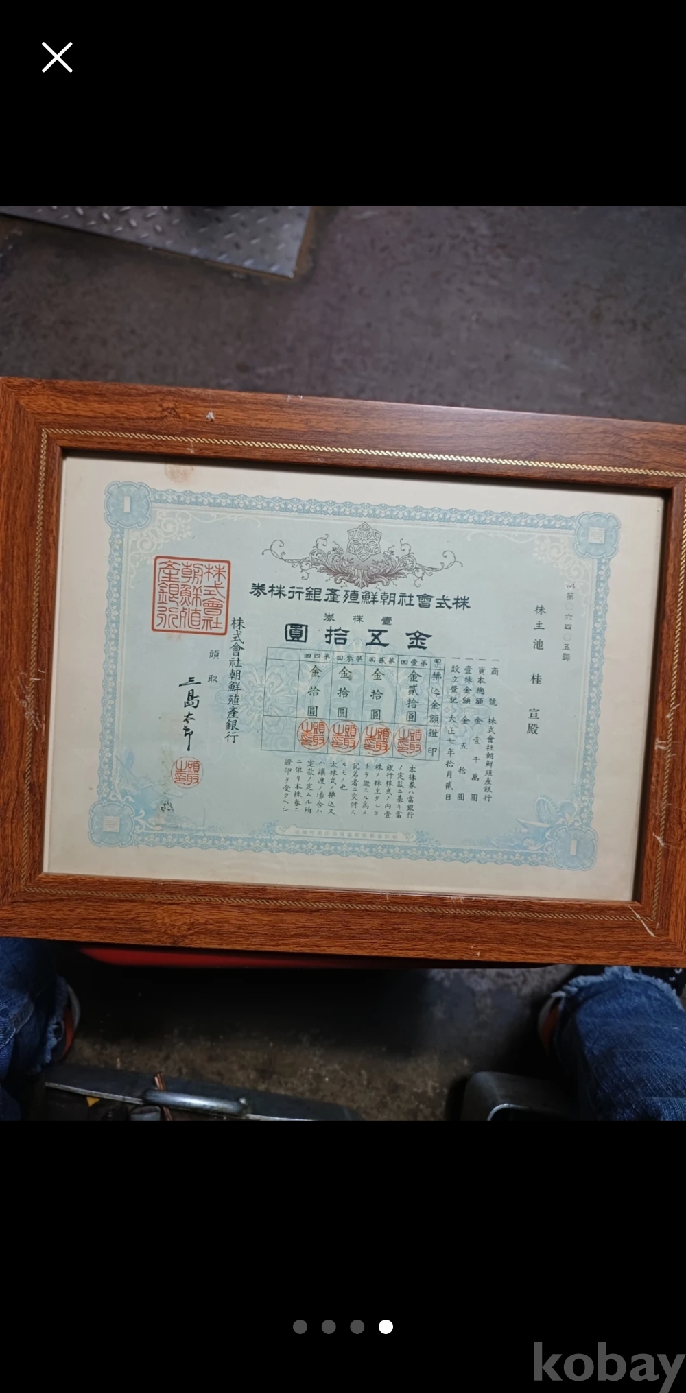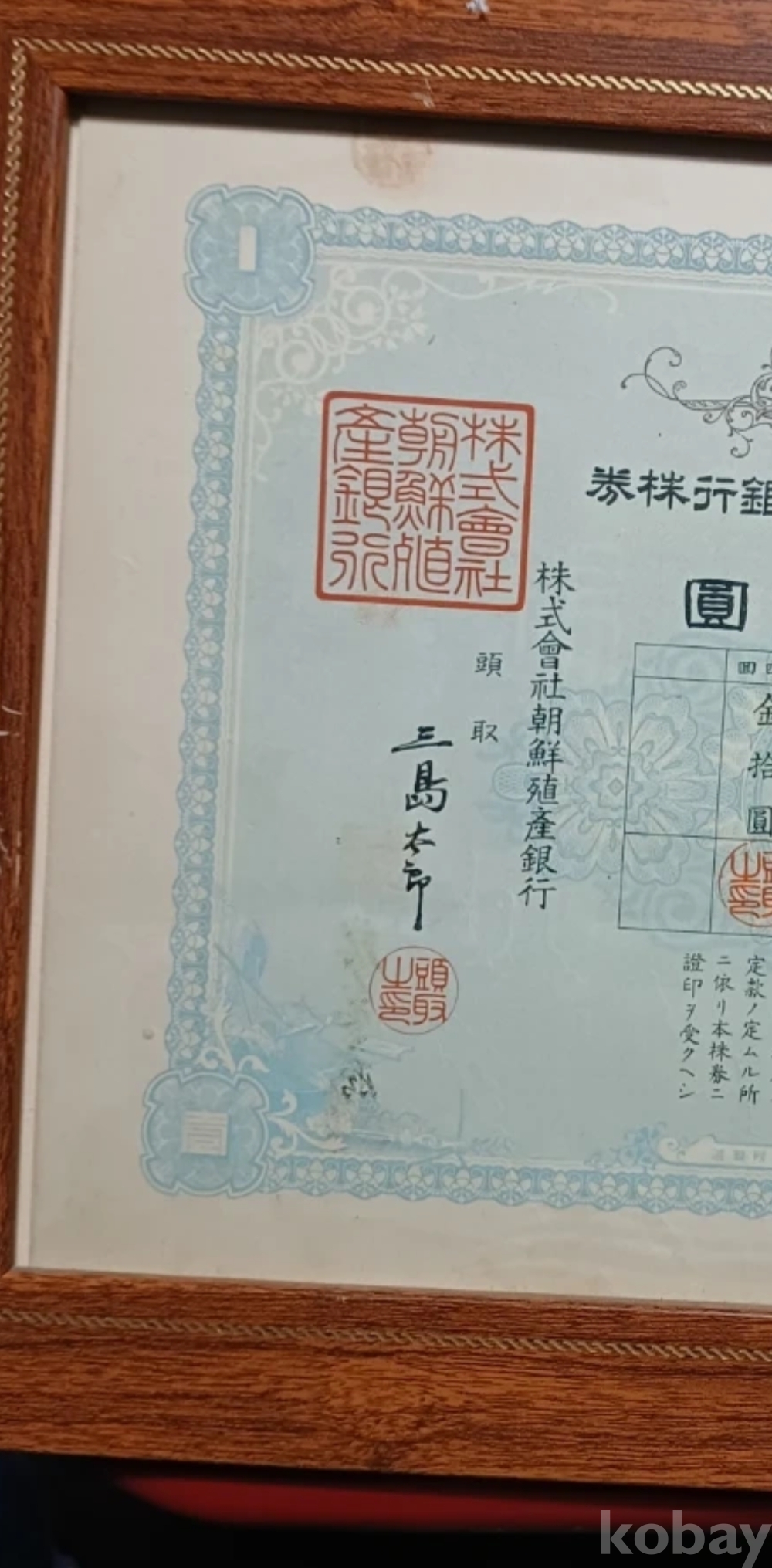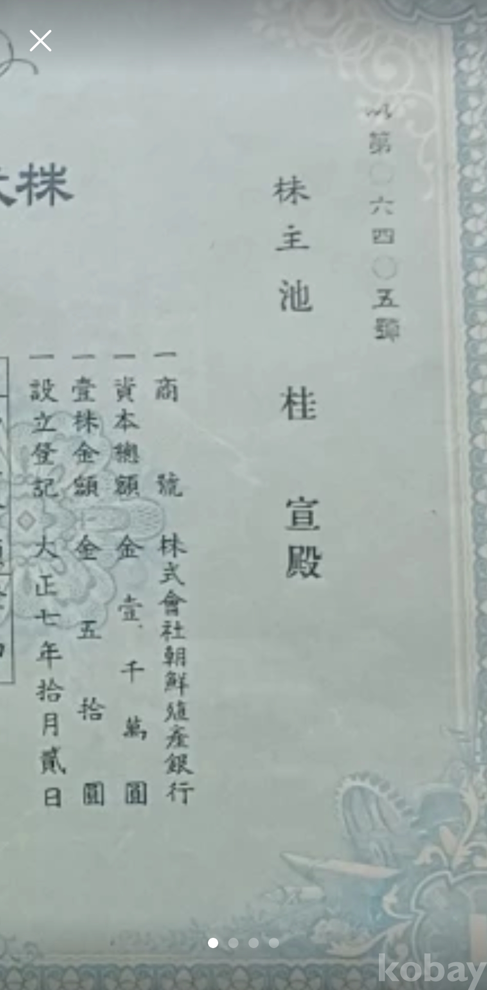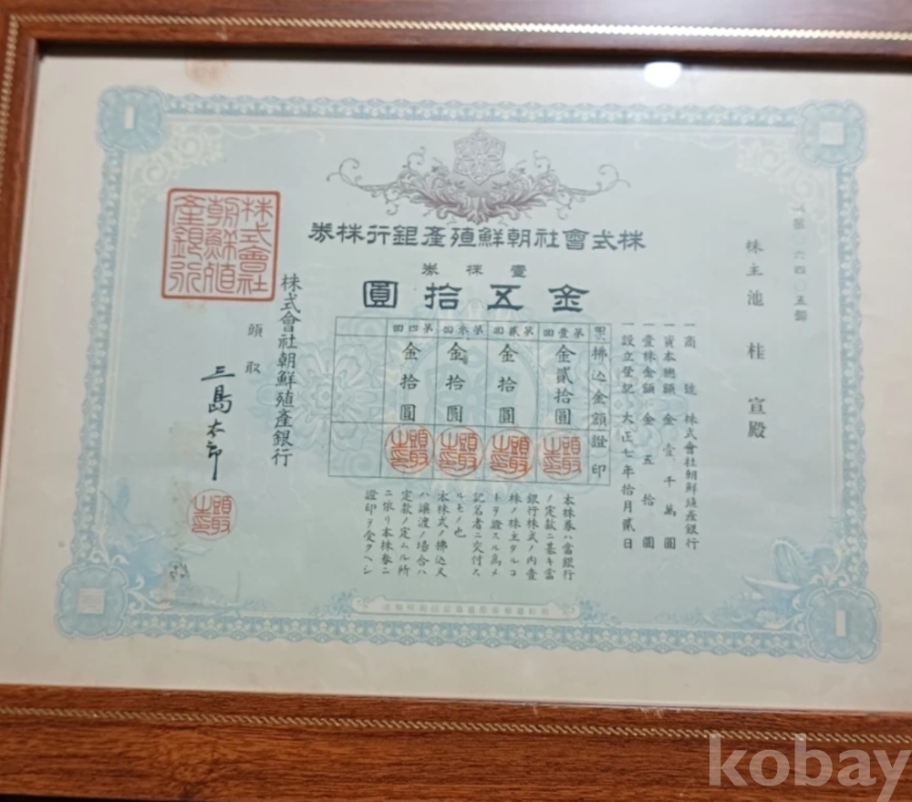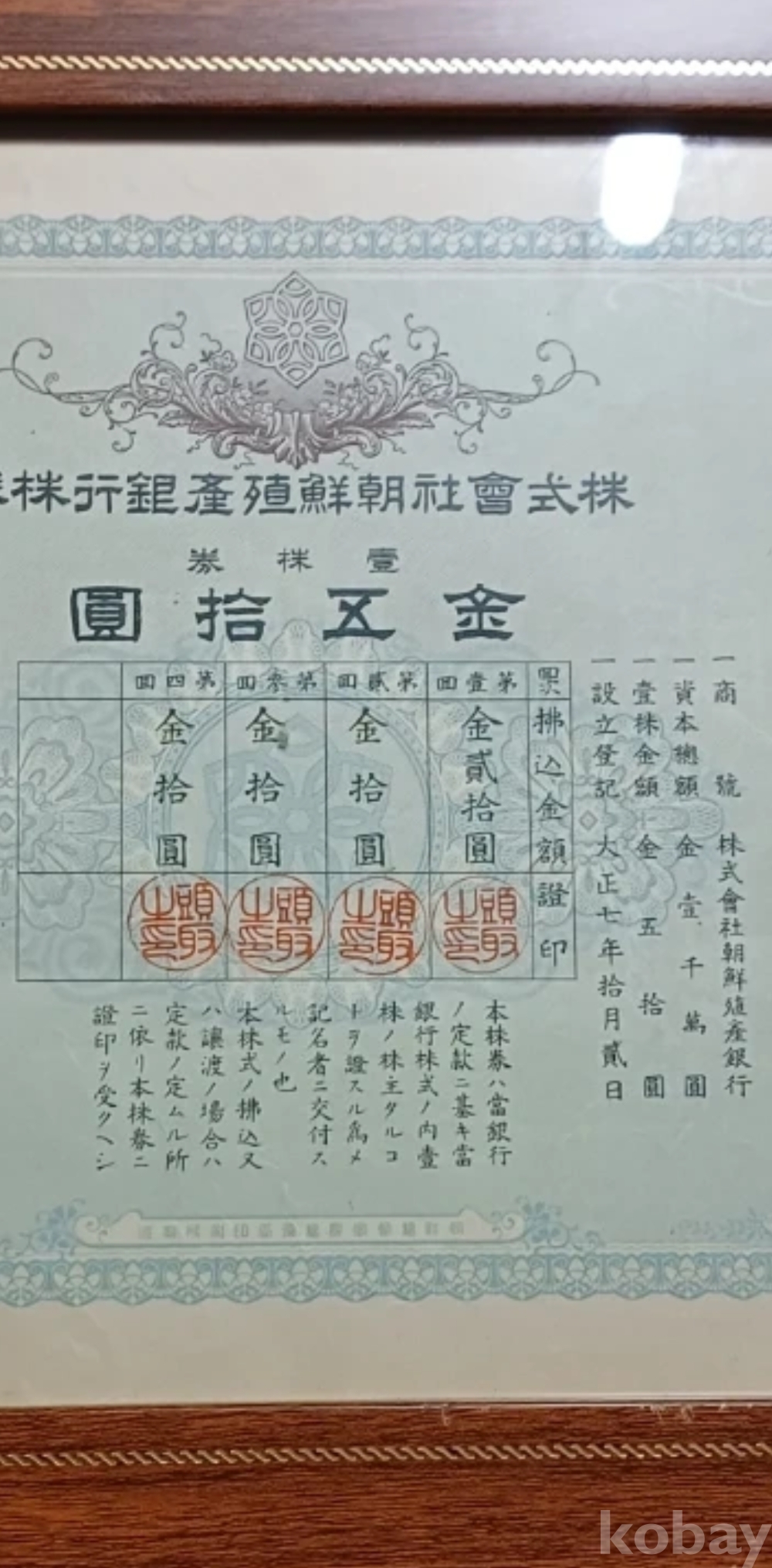 일제강점기 금융사의 핵심 기관이었던 **조선식산은행(朝鮮殖産銀行)**의 설립 초기 주권입니다. 단순한 고문서가 아닌, 수집 가치가 매우 높은 초기형 완납 주권입니다.