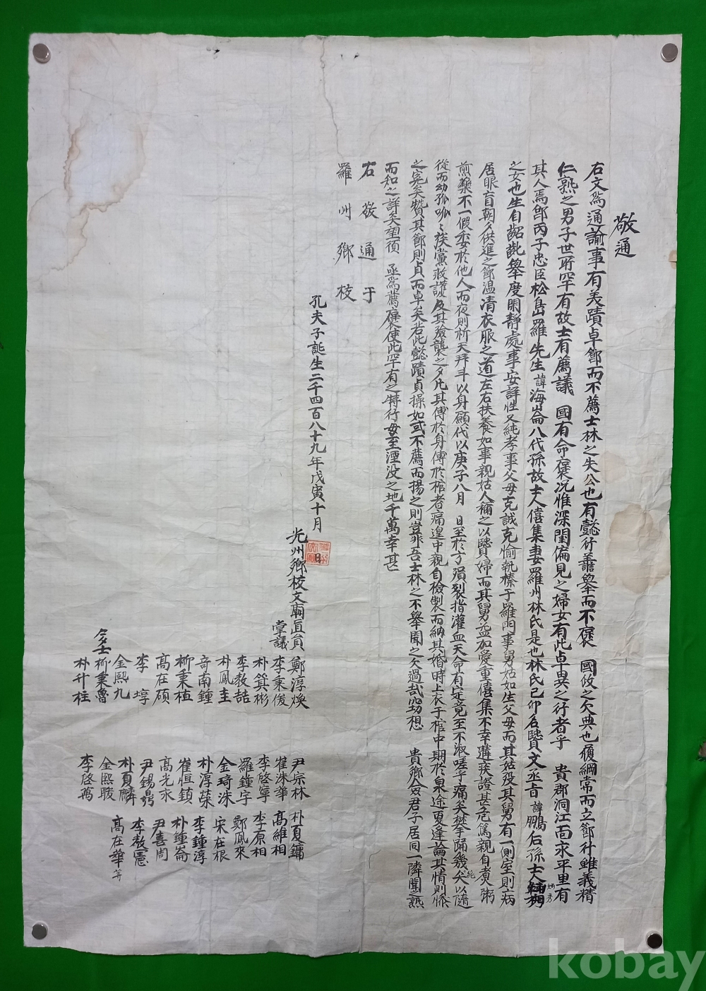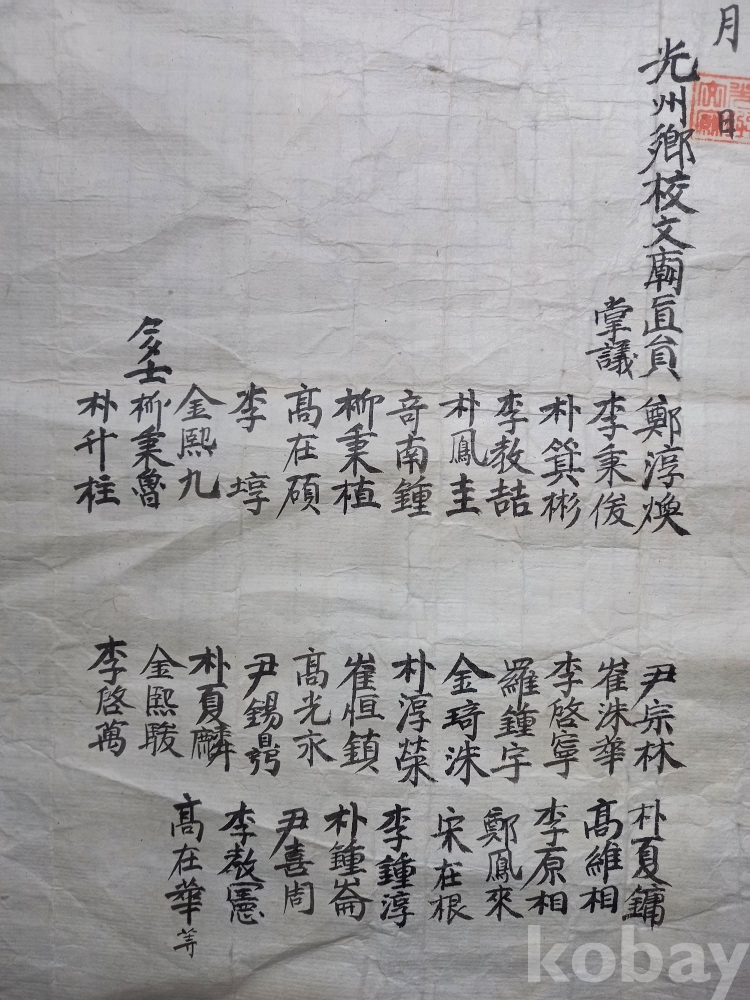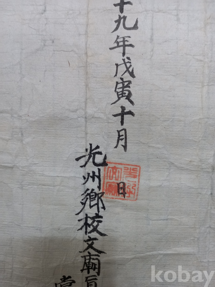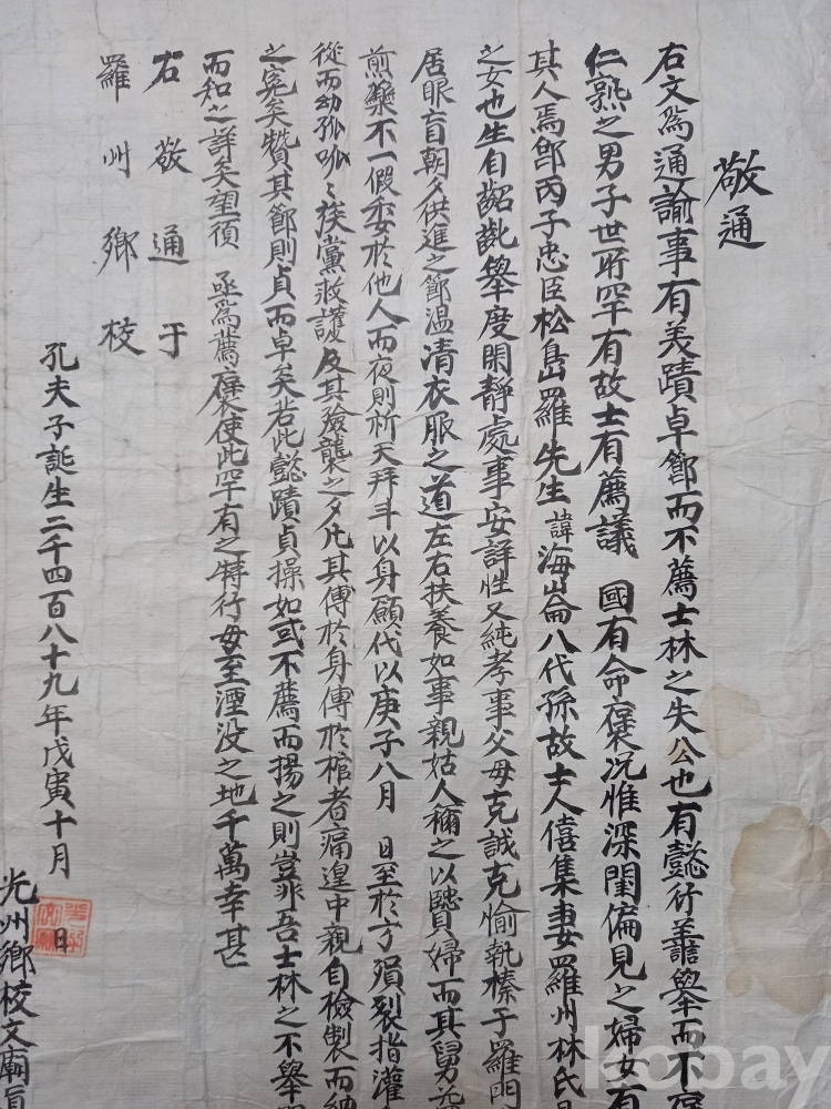 이 문서는 1898년(무인년) 10월에 나주향교에서 발행된 통문(通文)입니다. 통문은 조선 시대에 향교나 서원 등 유림 단체에서 공지 사항을 알리거나 의견을 모으기 위해 여러 곳에 보내던 통지문입니다.이 문서는 특정 인물의 효행(孝行)을 기리고 그를 포상하거나 널리 알리자는 취지를 담고 있으며 당시 지역 유림들이 효도를 얼마나 중요한 덕목으로 여겼는지, 그리고 향교가 지역 사회의 여론을 형성하고 도덕적 기준을 세우는 데 어떤 역할을 했는지를 보여주는 귀중한 사료입니다.